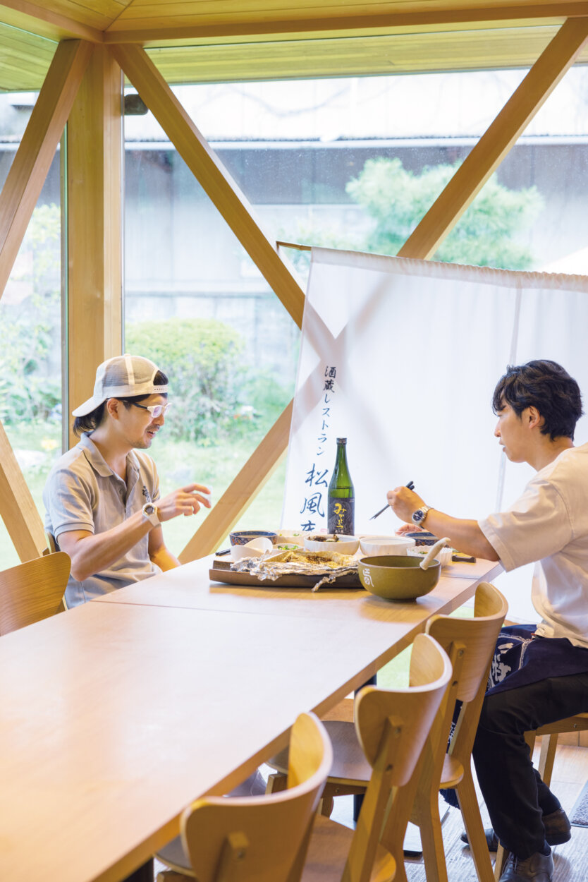 「帝松」を醸す松岡醸造の次期杜氏・井上弦也さんだ。この日は、松岡奨社長と仕事終わりに作戦会議の一杯。併設のレストラン『松風庵』の閉店後に、松岡社長お手製のおつまみを持ち込んで飲み始めた。