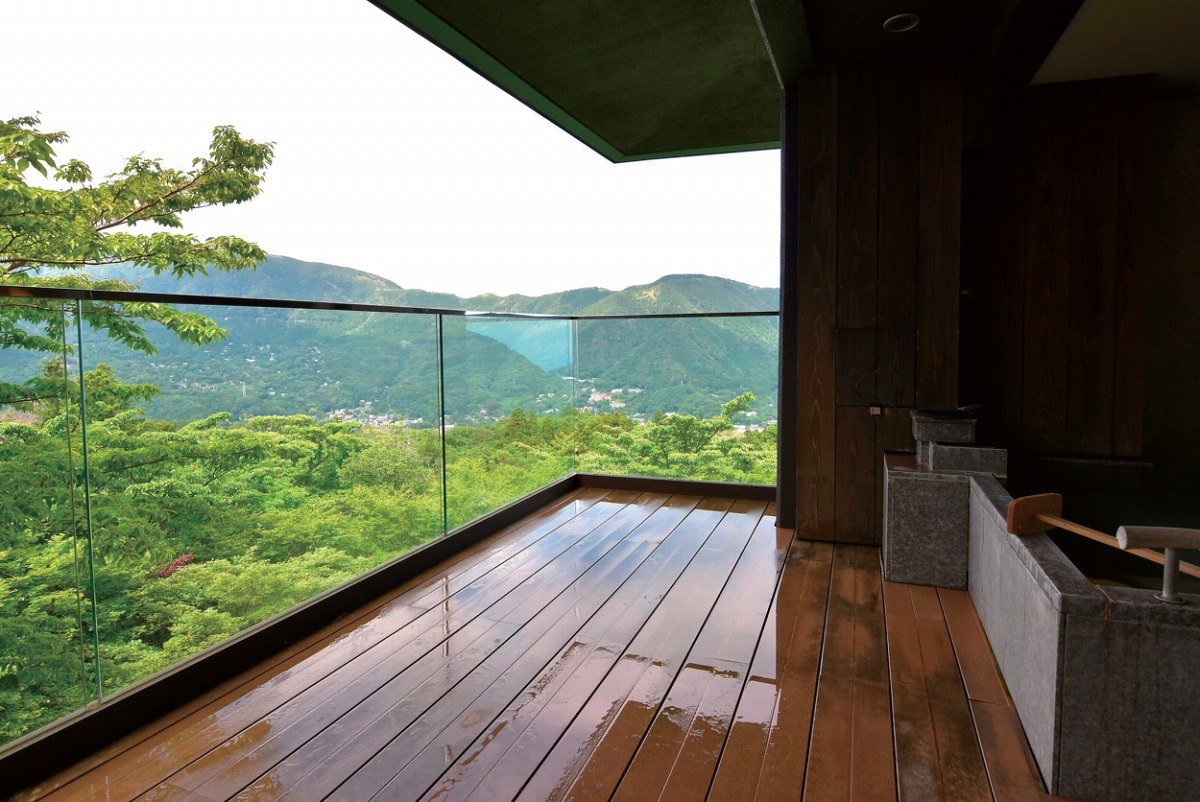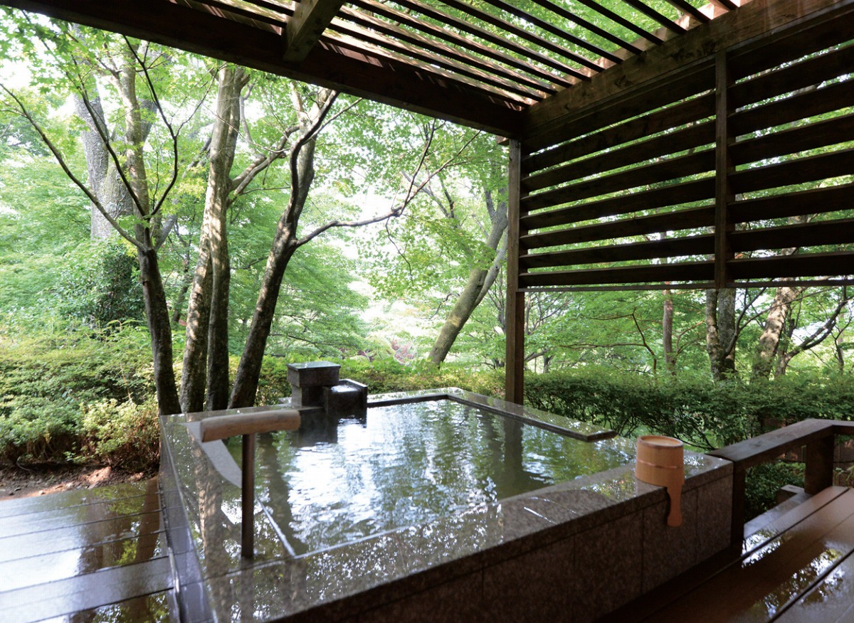和モダンな空間に近代日本建築を代表するデザイナーたちが手がけた銘家具を配し、デッキには約3700坪ある敷地の自然園や箱根連山を望む露天風呂がある。かすかに輝く黄金色のにごり湯は肌をすべすべにしてくれると評判で、源泉がかけ流されている。庭を眺めながら湯浴みができる大浴場も開放感があり心地よい。