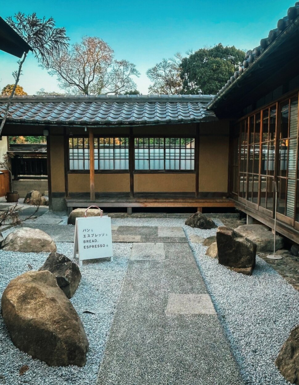『パンとエスプレッソと 姫路城』は、姫路に残された町家の価値を次世代に引き継ぐため、材木商の住んでいた築100年以上の住宅をリノベーション。2024年10月にベーカリーカフェとしてスタートさせた。木造建築は老化が進んでいたが、既存の建築に補強を行いながら、日本建築の特徴を生かした開放的な空間へとアップデートした。店に到着すると、さまざまな形の石が点在する、趣のある庭が出迎えてくれる。