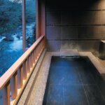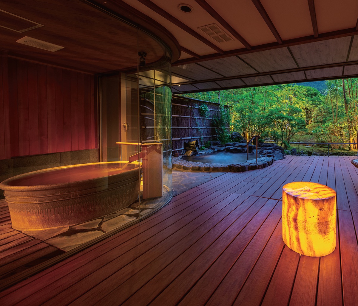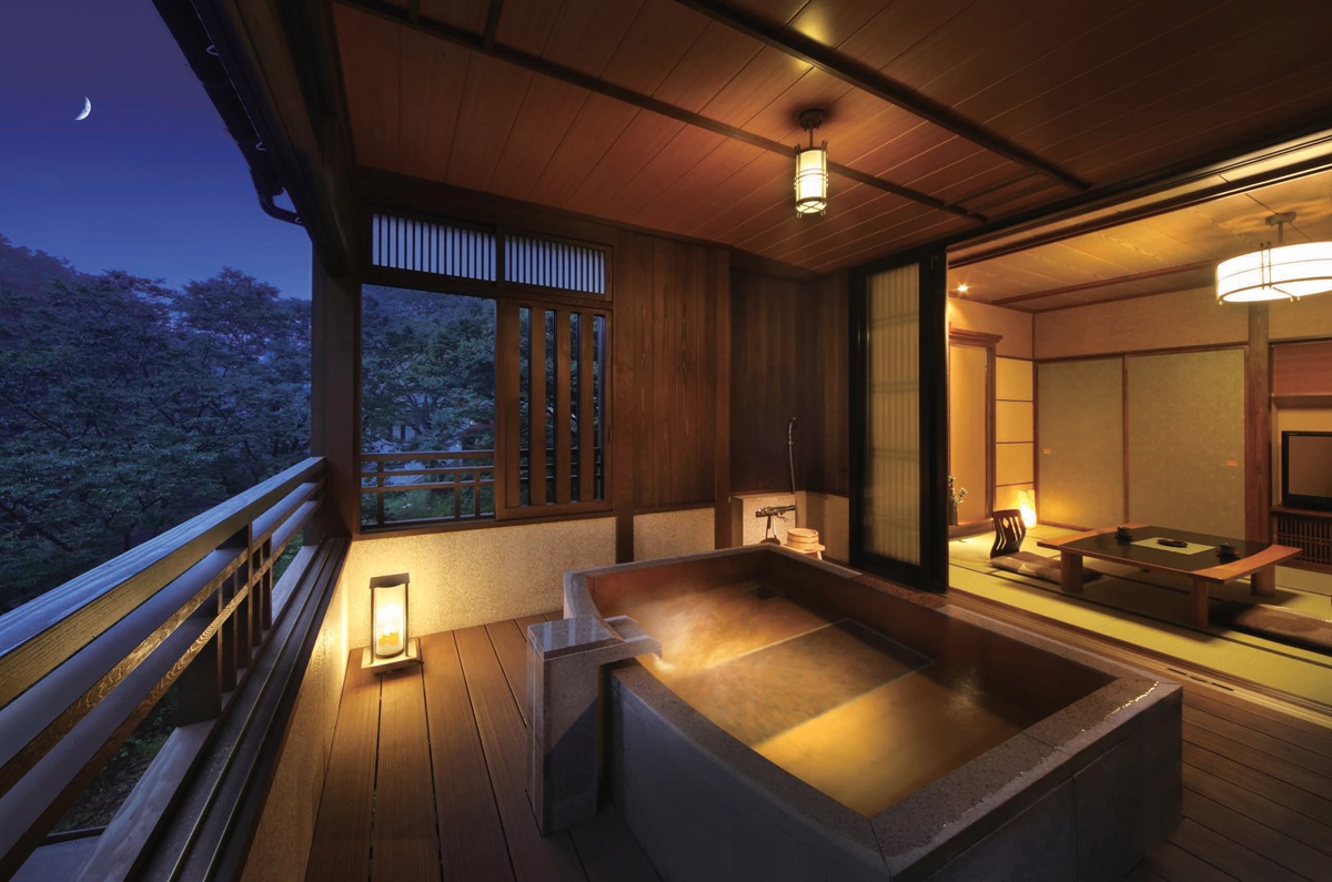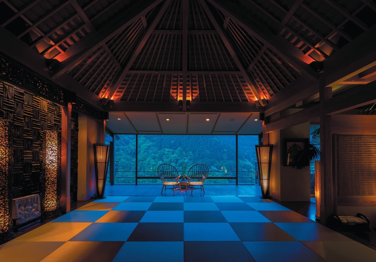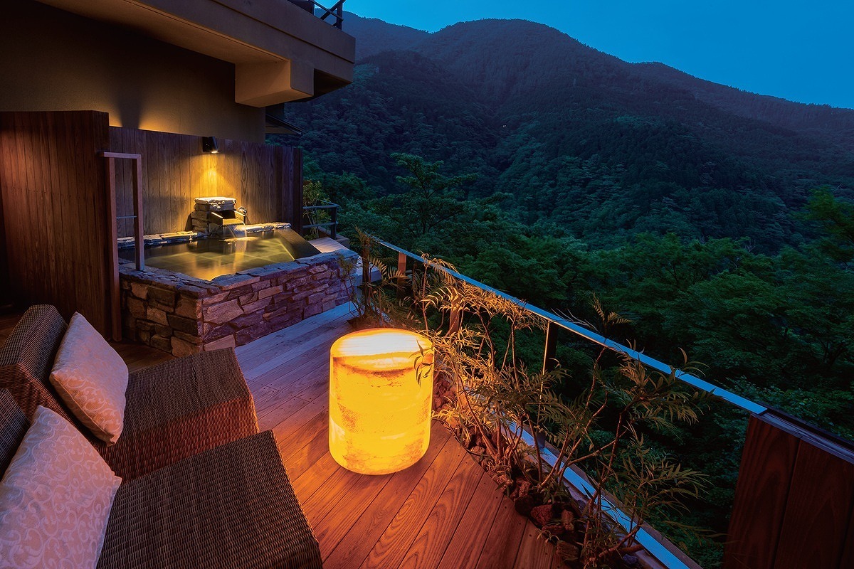 白足袋を穿いて過ごす畳敷きの館内は、日本の温泉旅館の伝統を受け継ぎつつアジアンリゾートテイストを融合し、独特の魅力をかもし出す。客室は4タイプあり、すべての部屋のオープンテラスには専用露天風呂を備え、箱根十七湯のひとつ、宮ノ下温泉がなみなみと注がれている。谷底から届く川音を聞きながら温泉に身を委ね、極上のひとときを過ごしたい。