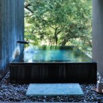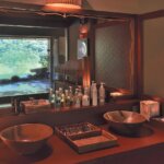 館内には展望バーカウンターやラウンジが2カ所に。木々の回廊の先の離れには、ウォーターガーデンや施術を受けるゲスト専用の貸切露天風呂を備えた直営スパもある。五感を潤すハンドトリートメントで身体を解きほぐしたあとは、広い湯船を独占したい。