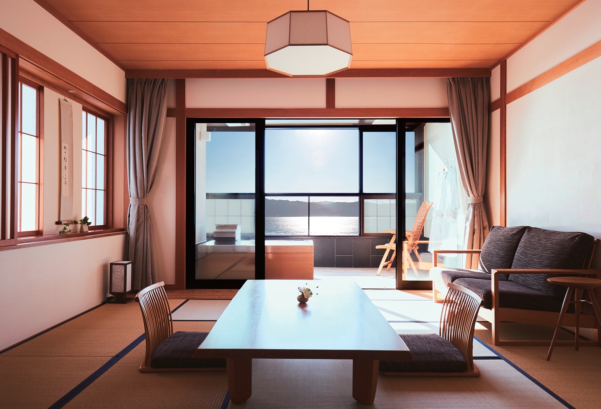 エントランス+和室10畳+掘りごたつ風ダイニング+ミニキッチンが備わり、4名まで宿泊できる。テラスには露天風呂とリビングをしつらえ、湯涼みにも最適。和室タイプは5室を用意。