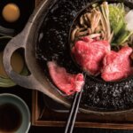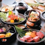 山形の厳選食材や湧き水を使った食事は、旬の素材を伝統的な技法で調理した和会席膳。メインの「蔵王牛陶板ステーキ」で希少なブランド牛の旨味を噛みしめたい。ひとつの鍋ですき焼きとしゃぶしゃぶが同時に楽しめる宿名物「蔵王牛すきしゃぶ鍋」は1日4組限定の逸品だ。