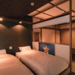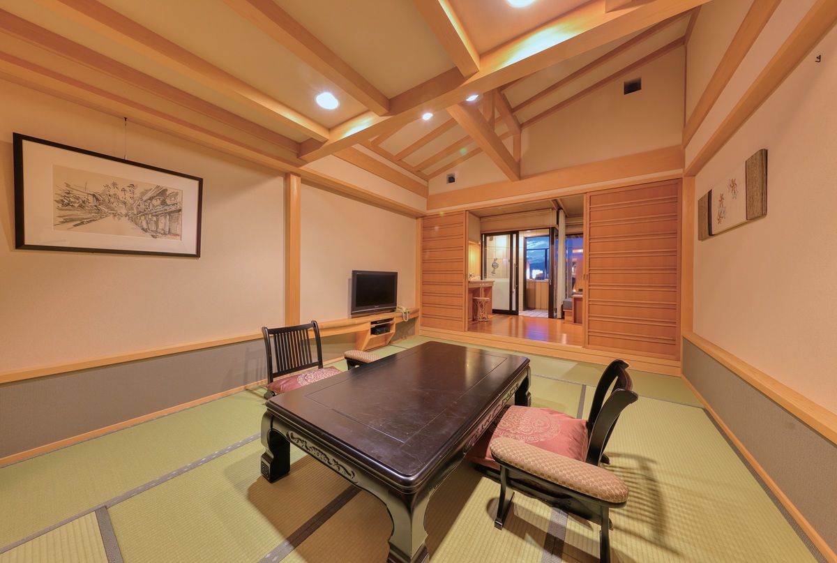 2階建ての蔵を全面改装した離れ。広間・和室・リビング・ベッドルーム・バーカウンターを配した贅沢な空間に、100%の自家源泉かけ流しの露天風呂を備える。