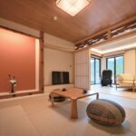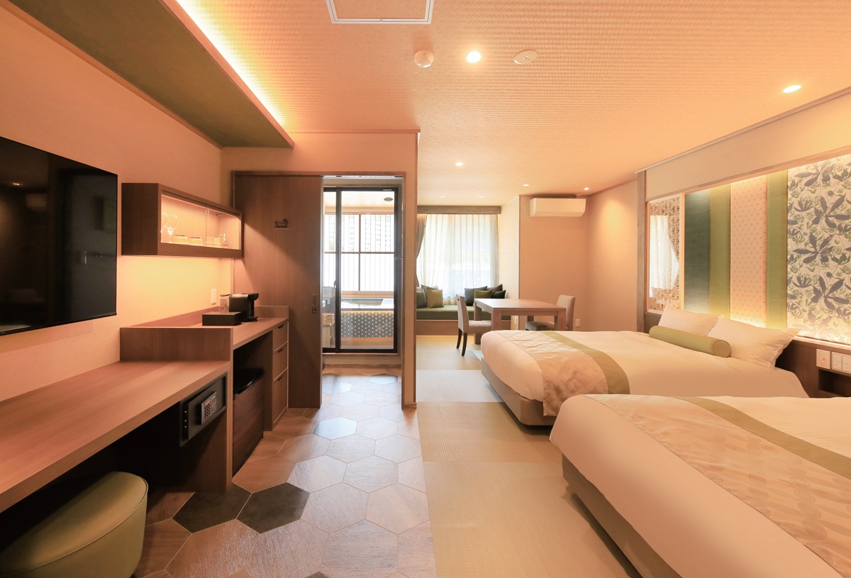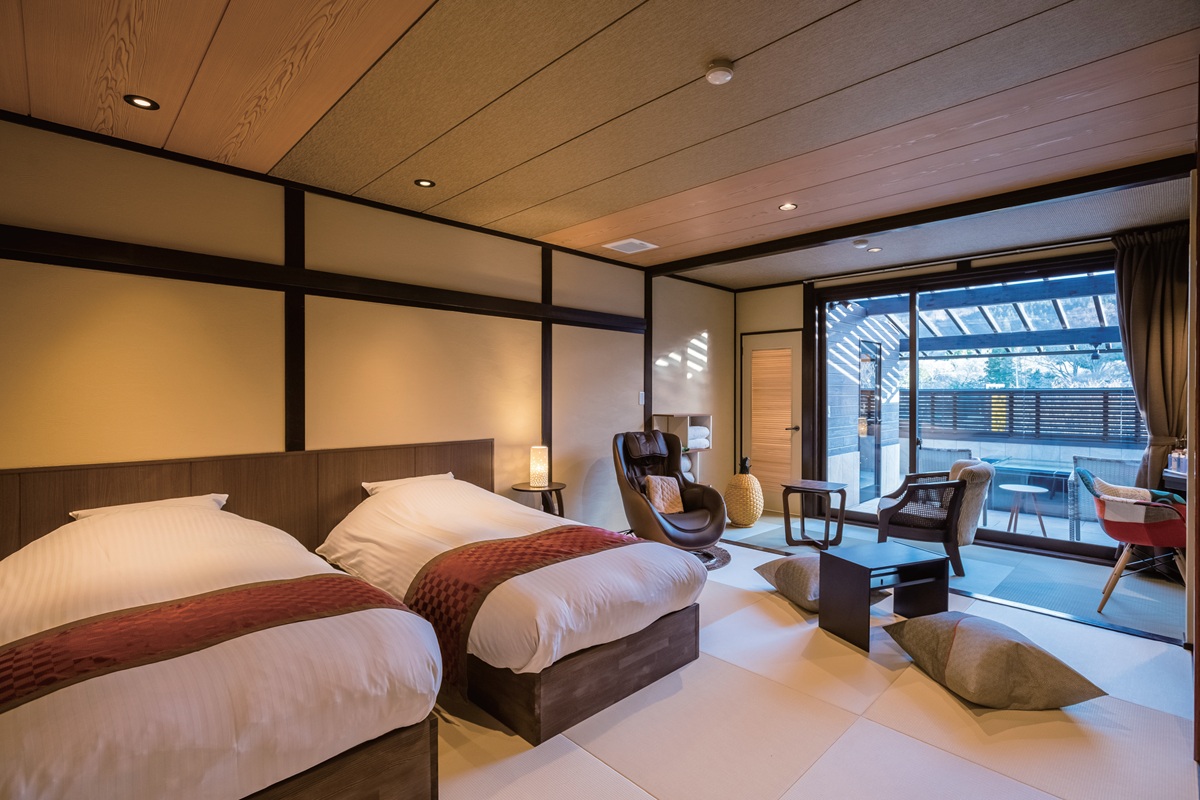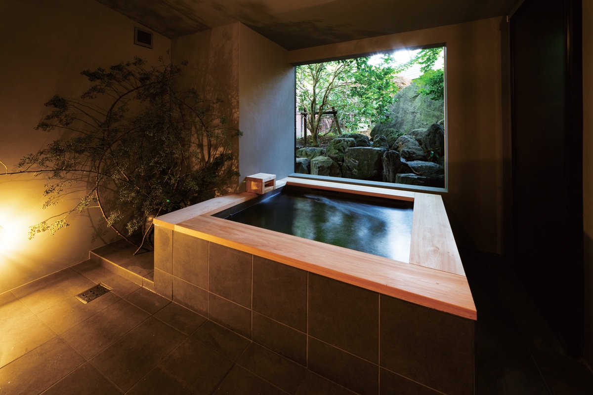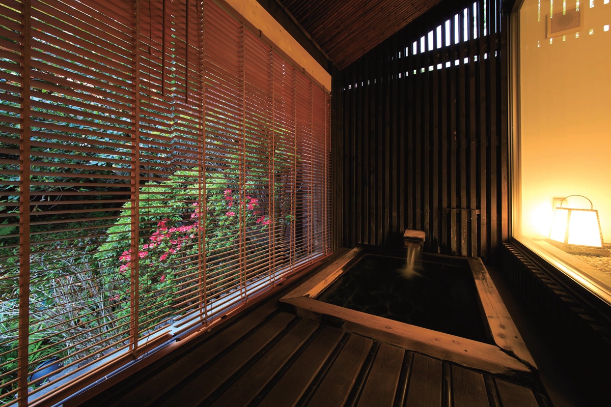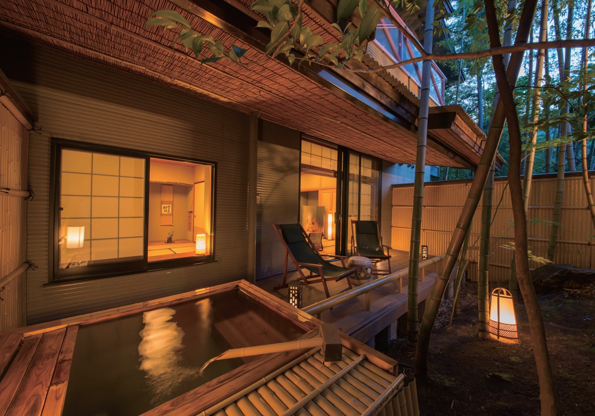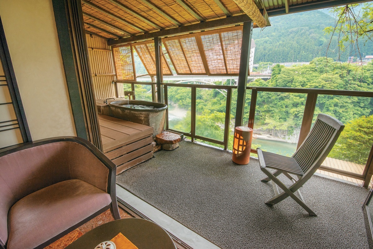 渓谷の景観を楽しみたいなら「木の館」へ。花鳥風月や日本の伝統色による意匠装飾がなされた、8室の露天風呂付き客室が備わる。また、温泉旅館の風情を楽しめるのが料亭旅館風の「木心亭」。各月の時節の花木をテーマにした優美なしつらえの12室は、6室に庭を眺めながら湯浴みができる専用露天風呂が付く。
