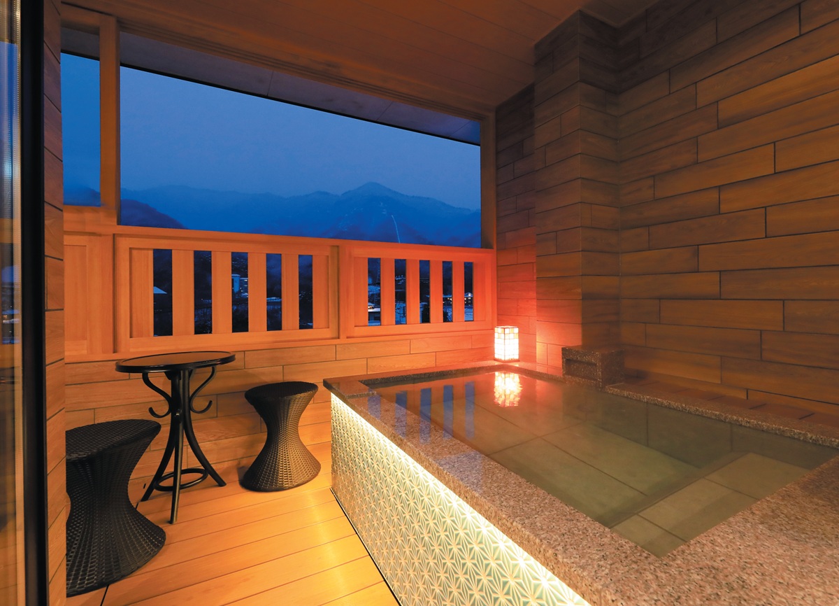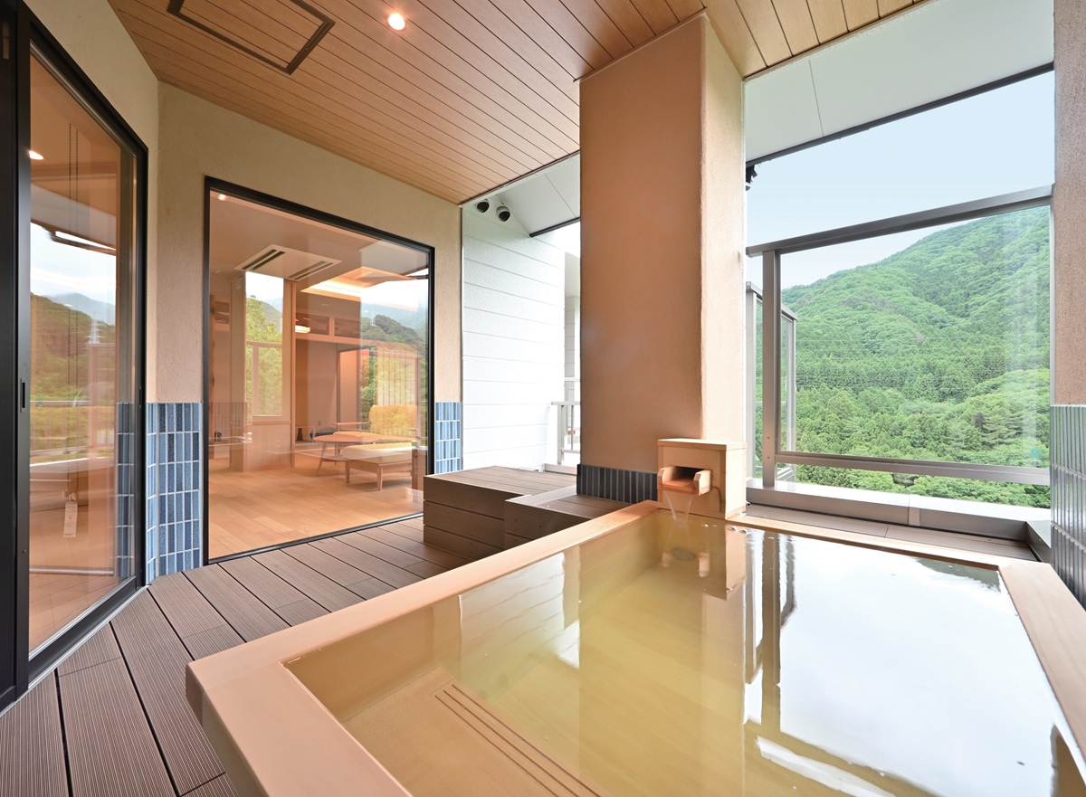 『鬼怒川(きぬがわ)パークホテルズ』【「木心亭」五月の間】3万9750円〜 室内やデッキ、名湯に満たされた檜造りの湯船から小さな日本庭園を眺められる。「木心亭」の露天風呂付き客室は檜造りの湯船が2室、石造りの湯船が4室