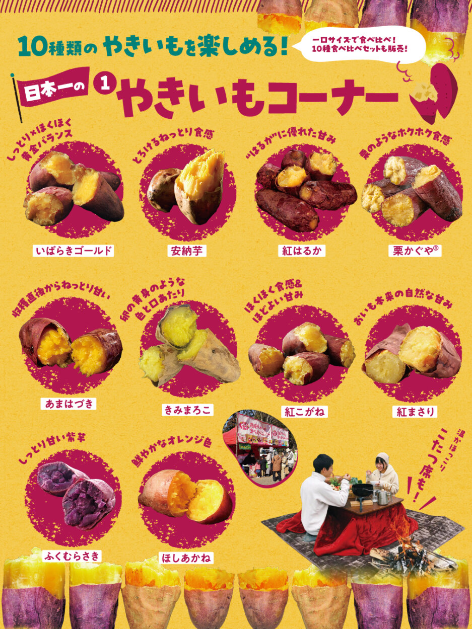 イベントの大きな魅力は、らぽっぽスタッフが厳選した10種類のやきいもを食べ比べできること。全国に50種類以上あるといわれるさつまいもの中から選び抜かれた、やきいもに適した品種が並びます。焼き立てのやきいもを通して、品種ごとの甘みや食感の違いを楽しむことができます。