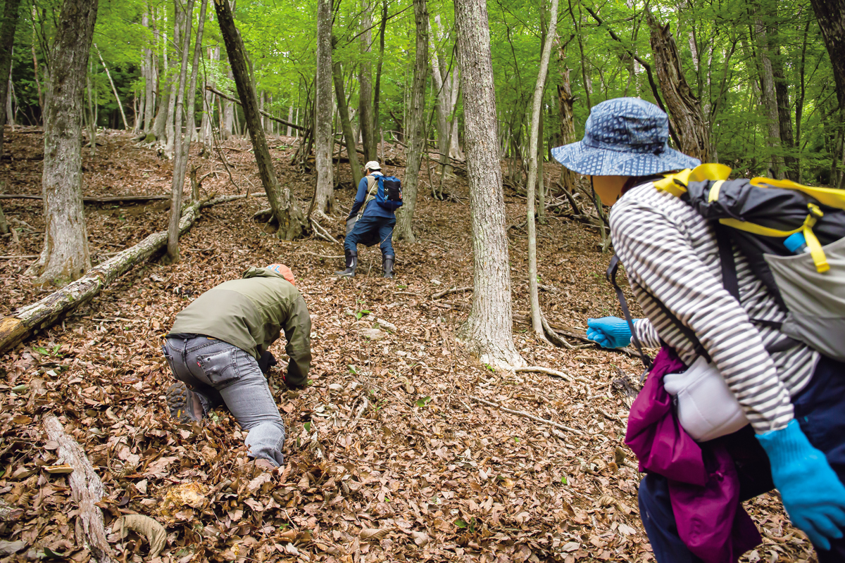 歩き出したとたん、さっそくシェフの目がキラリンと光った。道端に大ぶりのきのこを発見したのだ。「よっしゃあ、今夜はきのこ鍋だ!」と心の中で勝手にカッツポーズをした。やがて、シェフは山道をスッと外れ、森へ分け入った。あわてて後を追うも、これが想像以上の急斜面。落ち葉ふかふか、倒木はゴロゴロ。