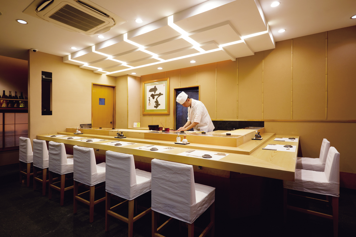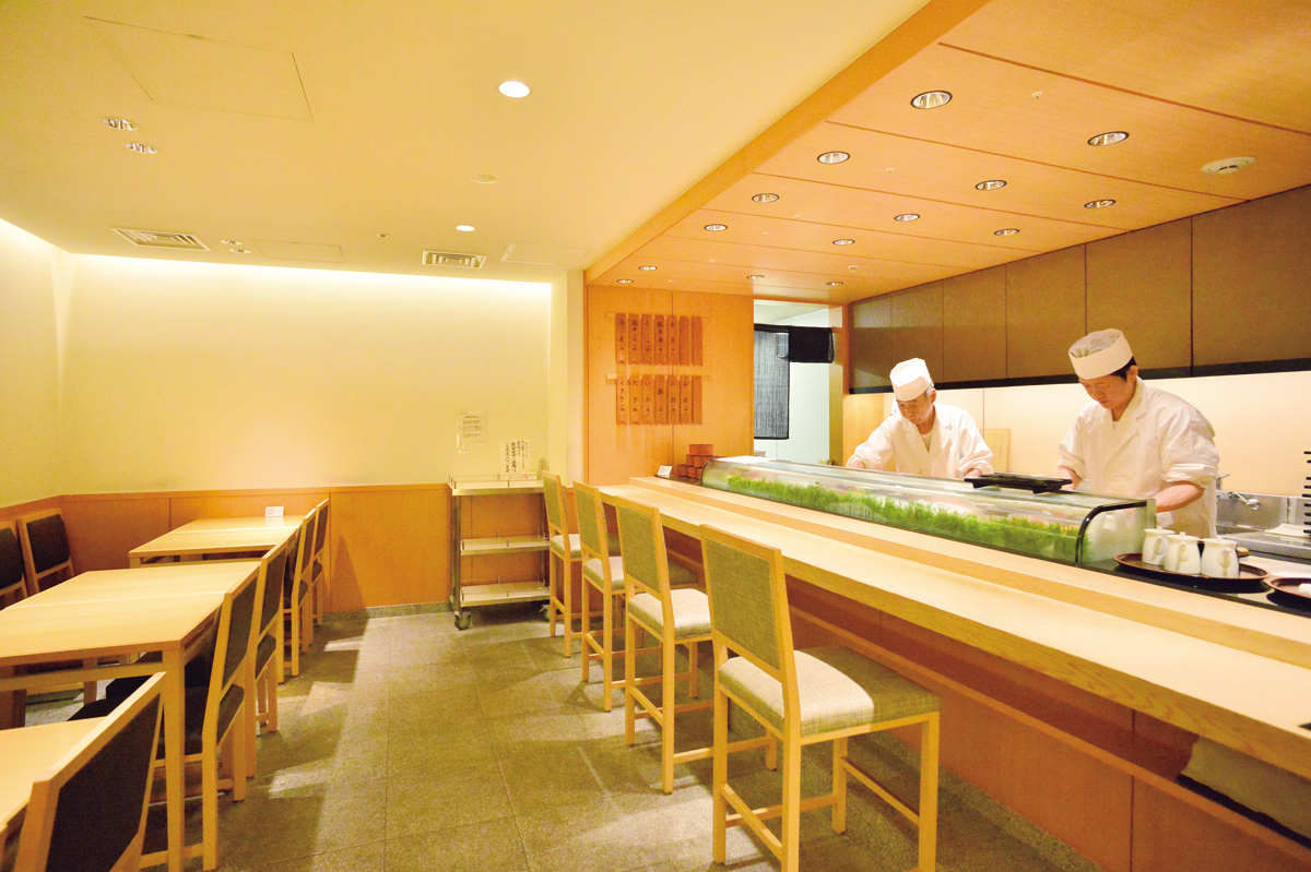 寝具や和装小物が並ぶ売り場を抜けると藍色に白で染め抜かれた“鮨”の文字。それをくぐると、職人らしい清々とした風体の大将が笑顔で迎えてくれた。