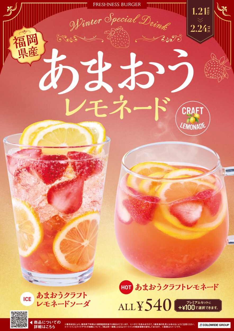 ドリンクは、「福岡県産あまおう」を使ったクラフトレモネードが発売される。