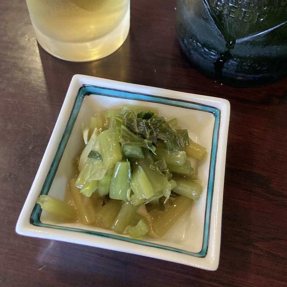 早速ビールを頼んだところ、お通しの「あげそば」と一緒に到着しました。ポリポリ食べながら飲むビールの美味しいこと。続いて蕎麦前でいただいたのは、「わさび醤油漬」です。わさびは長野県の名物で、全国トップクラスの出荷量を誇ります。チビチビ食べるわさび醤油漬とビールの相性もサイコーでした。