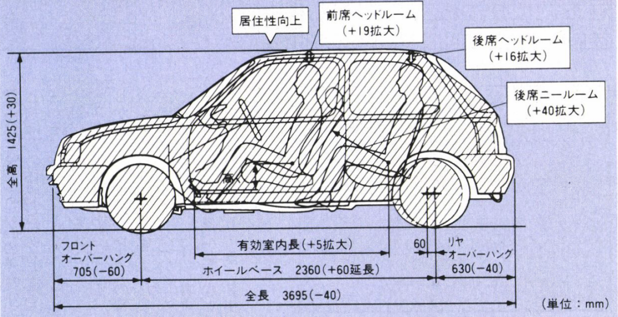 2代目マーチのボディサイズは3ドア、5ドアとも全長3695×全幅1585×全高1425mm。初代が全長4735×全幅1585×全高1395㎜だったので、全長は45㎜短くなっている。フルモデルチェンジのたびに多くなる傾向にあるなか、ダウンサイジングは珍しい。特に2代目マーチはバブル期に開発されたクルマで、その時期のクルマはより豪華に見せるためサイズアップさせるというのが常套手段だったことを考えると異例と言えるだろう。