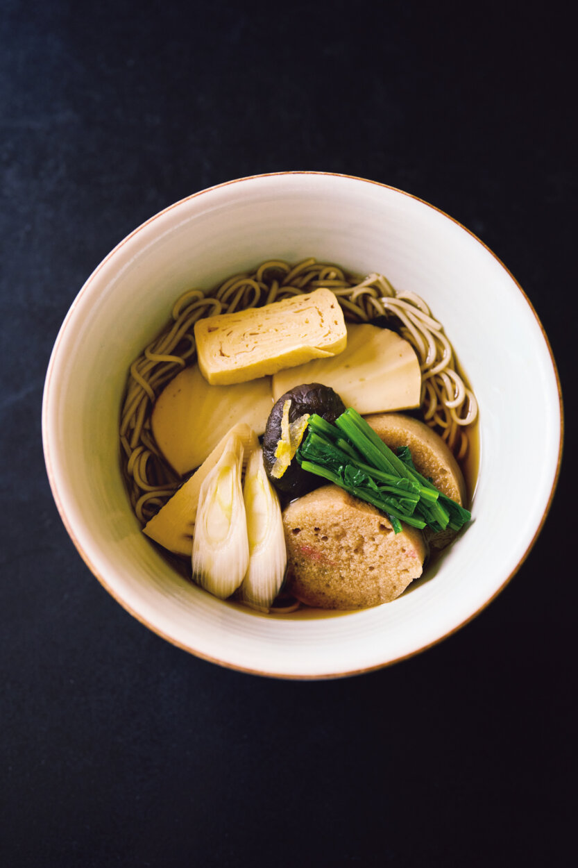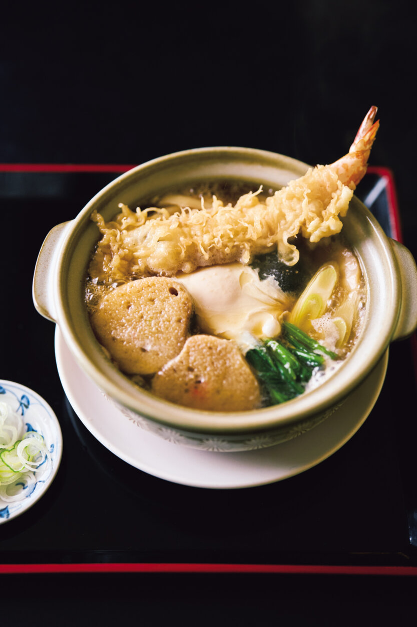 「普段、お蕎麦屋さんでは蕎麦前をつまんで一杯やって、最後にもり蕎麦を手繰る……という流れですよね。でも鍋焼きうどんは、それひとつでフルコース的にすべてが完結する小宇宙なんです。炊いた野菜や天ぷら、それぞれの具がきちんと仕事をされていて、一品でまさに懐石料理のコースのようです」