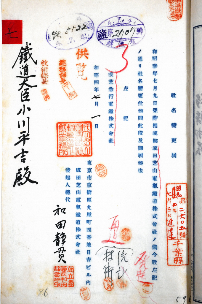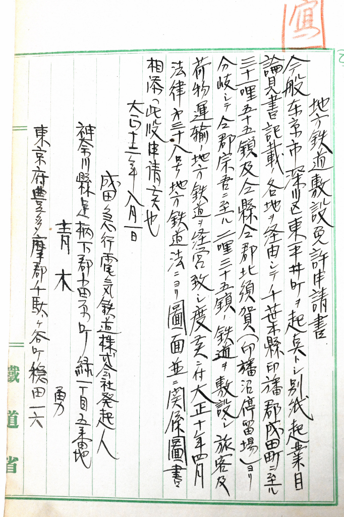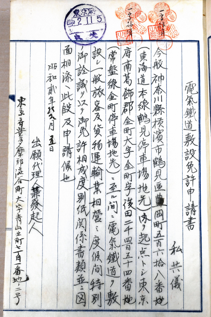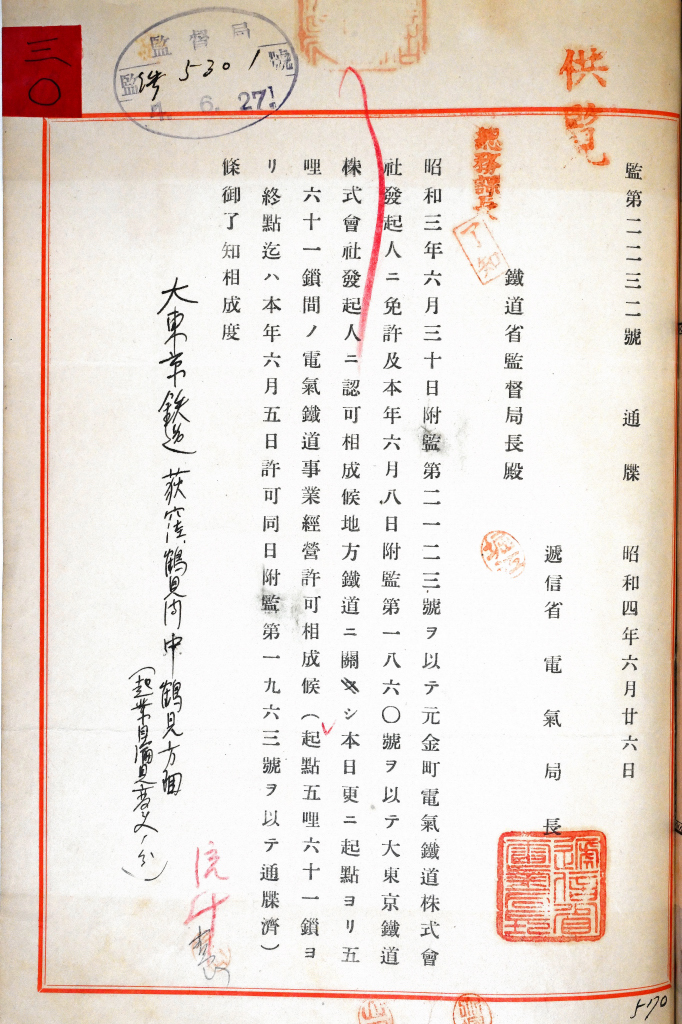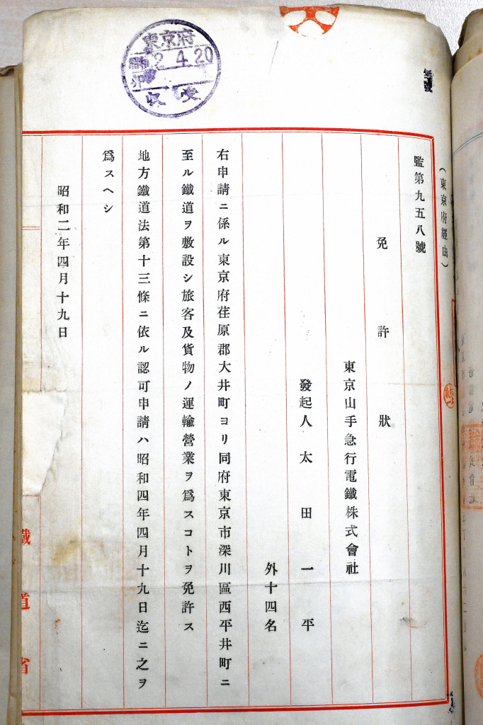 東京山手急行電鉄あてに鉄道省から発出された免許状=資料/国立公文書館蔵