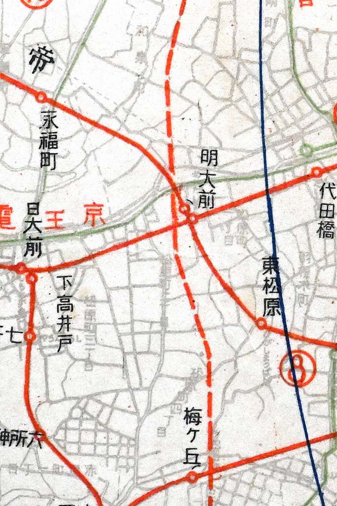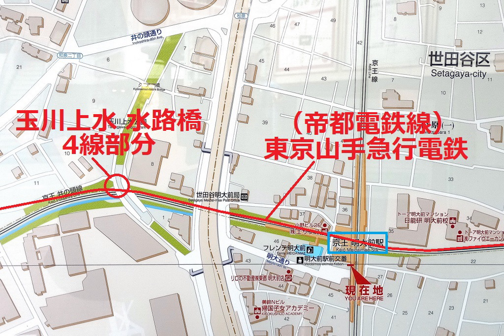 ところが、1936(昭和11)年になるとさらに規模を縮小し、終点を洲崎から駒込(豊島区駒込)までの31.2kmに改めた。そして、土地の収用が困難な地域を避けるように、途中の世田谷区を通るルートの一部も変更した。その区間には、今なお建設当時の痕跡を見ることができる場所がある。京王線の明大前駅近くを流れる現在は暗渠となっている「玉川上水の水路橋」がそれである。