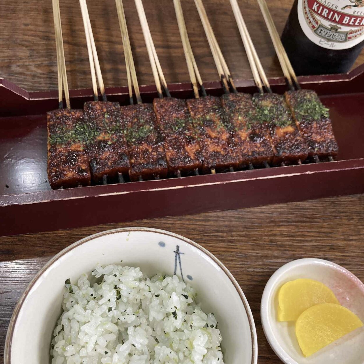 続いては、「でんがく定食です」。菜めし(なめし)が付いてきます。この界隈の定番のようで、大根の葉でしょうか、細かく刻んだ葉の食感が食欲をそそります。そして、田楽の基本である豆腐が8本も並びました。ビールで4本、菜めしで4本、半分ずついただきました(笑)。大満足の、でんがく定食でした。