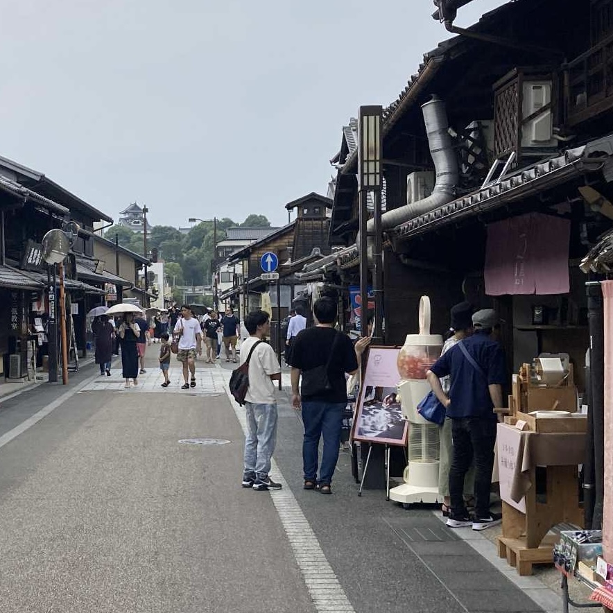 では、城下町巡りから始めたいと思います。犬山城は、名鉄名古屋駅から名鉄名古屋本線で約30分、「犬山駅」か「犬山遊園」から歩いて行くことができます。お城の南側に広がる犬山城下町は、江戸時代のまま残る風情ある街並みで、多くの飲食店が軒を並べており、食べ歩きの名所としても有名です。