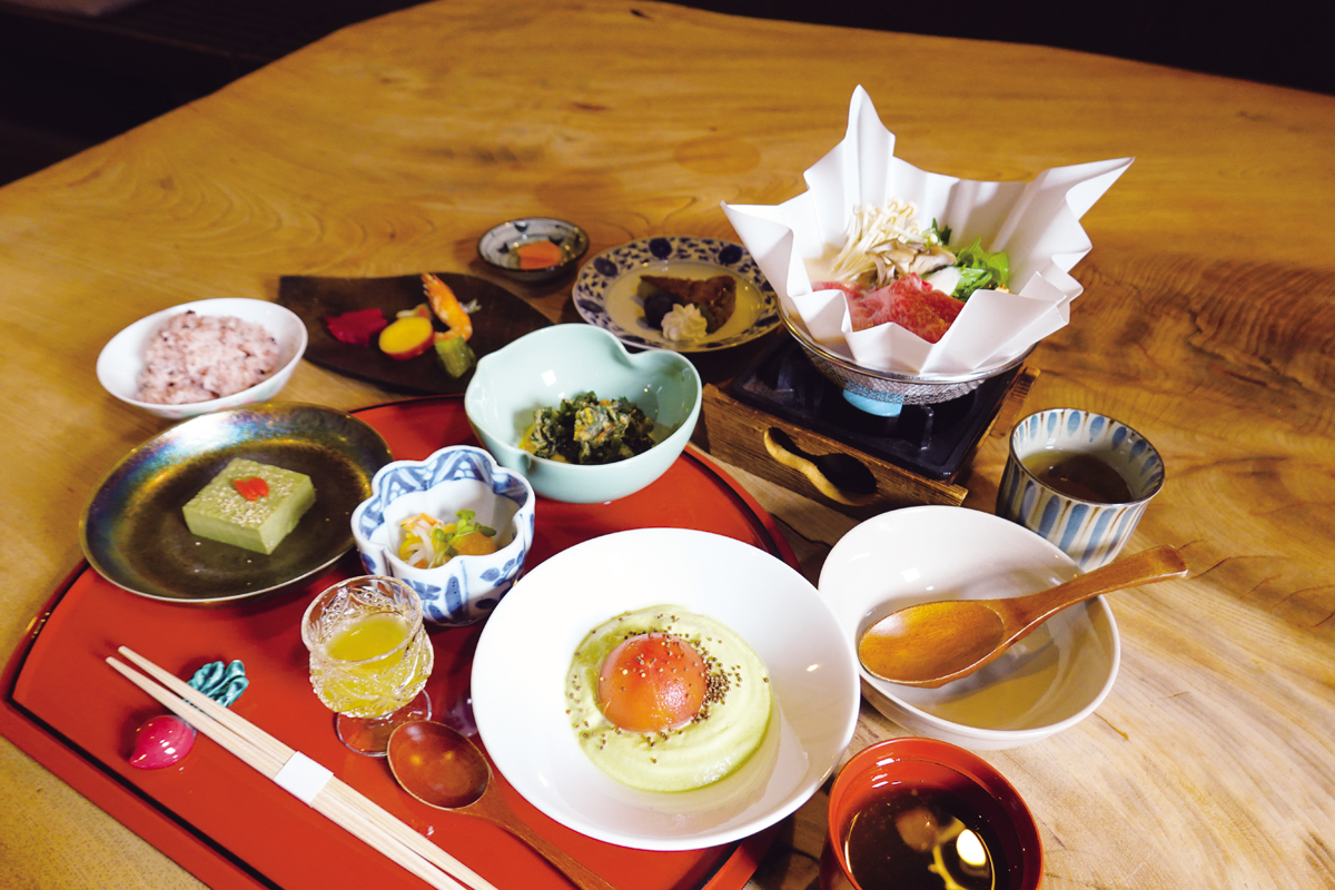 そんな町でぜひ味わってほしい料理がある。河合町などで採れる薬草を使った『蕪水亭』の薬草ミニ会席だ。最近、新板長に就任した北平一樹さんが食後に顔を出してくれた。