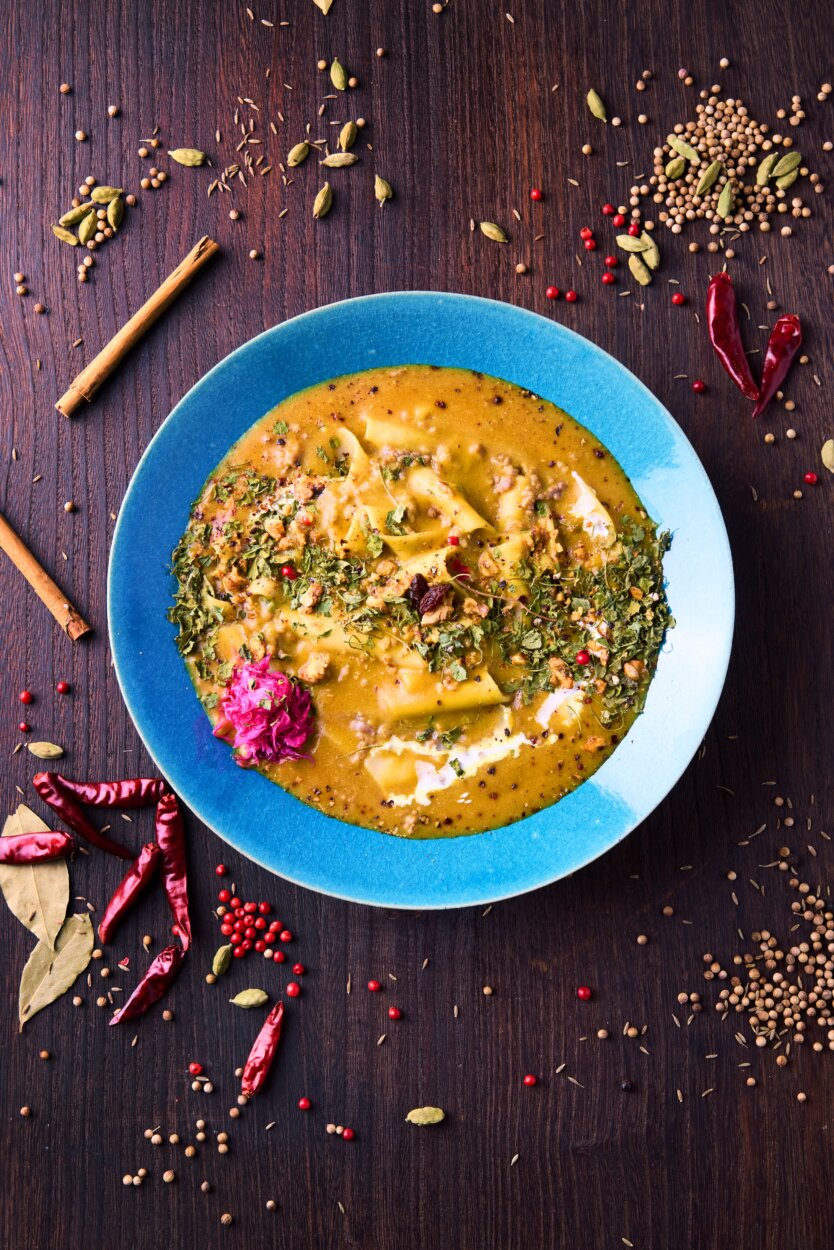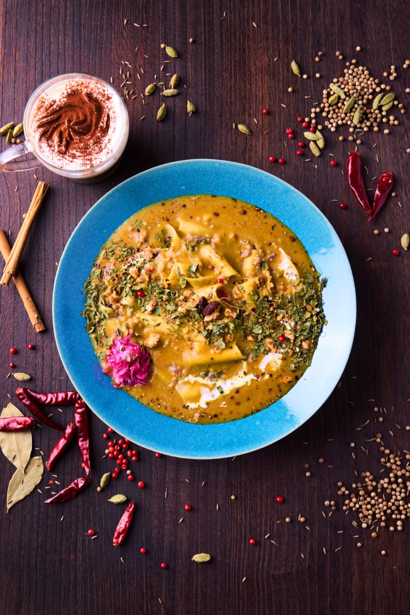主役となるのは、群馬県桐生市の名物として知られる「ひもかわうどん」。もっちりとした食感と、目を引く極幅の麺が特徴だ。その存在感ある麺に、こだわり抜いたスパイスを使用したオリジナルのスパイスカレーを組み合わせている。
