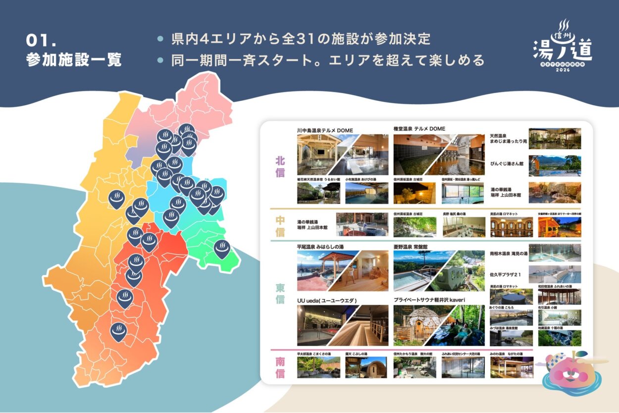 長野県内の温浴施設の利用促進に取り組む信州湯ノ道実行委員会は2026年2月6日から3月7日にかけて、県内全域の31施設が参加する周遊型のスタンプラリーイベント「信州湯ノ道2026」を初開催する。銭湯、温泉、サウナと個性豊かな施設を巡ってもらい、地域の魅力も再発見してもらう冬の旅を提案したい考えだ。