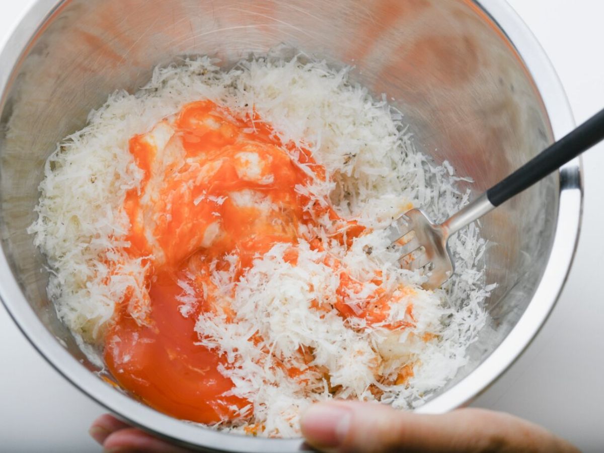2 ボウルに卵黄、削ったペコリーノチーズ、黒こしょうを入れてフォークなどでよく混ぜる。