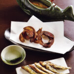 鮎は琵琶湖産。乾物類も手作りを貫くが、たとえば鮎節はワタあり、丸干しはワタなしのものを使うなど、単一の素材で異なる味わいを引き出すところにも妙技が光る。味の決め手は、注文ごとに炭火で焼き上げる一夜干し。少しずつ身を崩すことで鮎の風味と香ばしい焼き目の風味がスープに広がり、印象が変化していく。