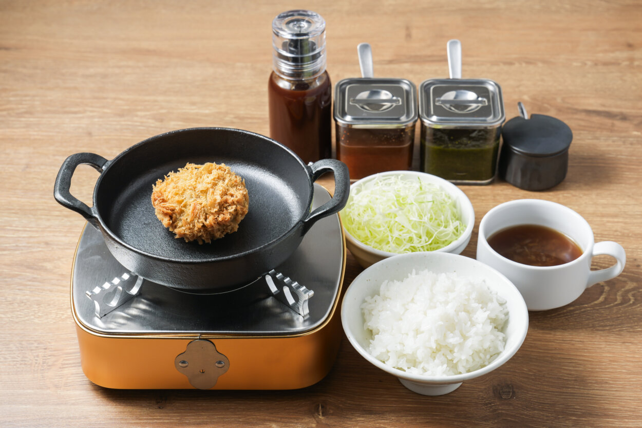 最大の特徴は、卓上に設置された鉄板でメンチカツの断面を焼き、自分好みの火入れに仕上げられる点。レア感を残したまま楽しむことも、香ばしく焼き上げることもでき、食べ手自身が“育てる”工程を体験できます。