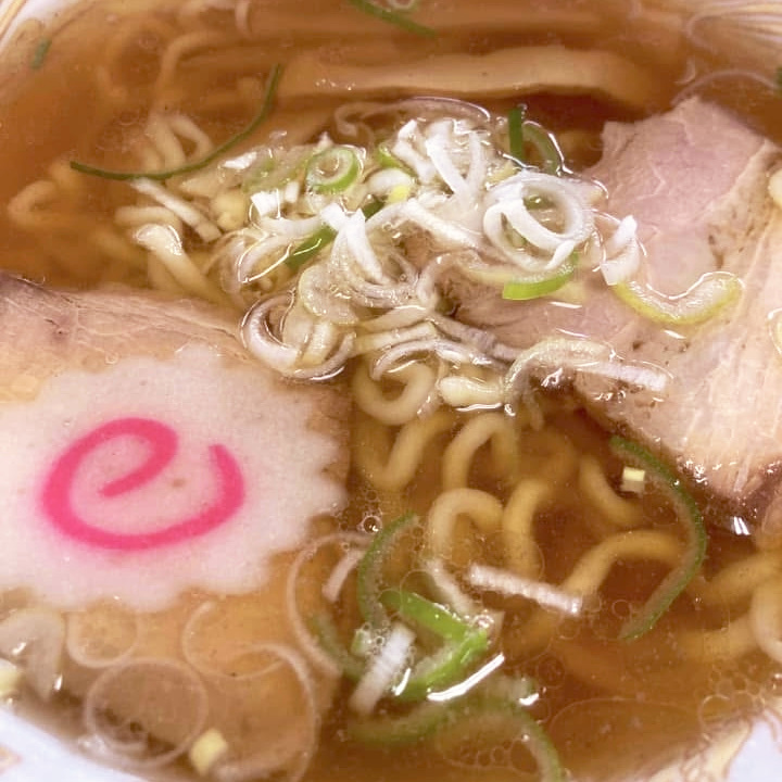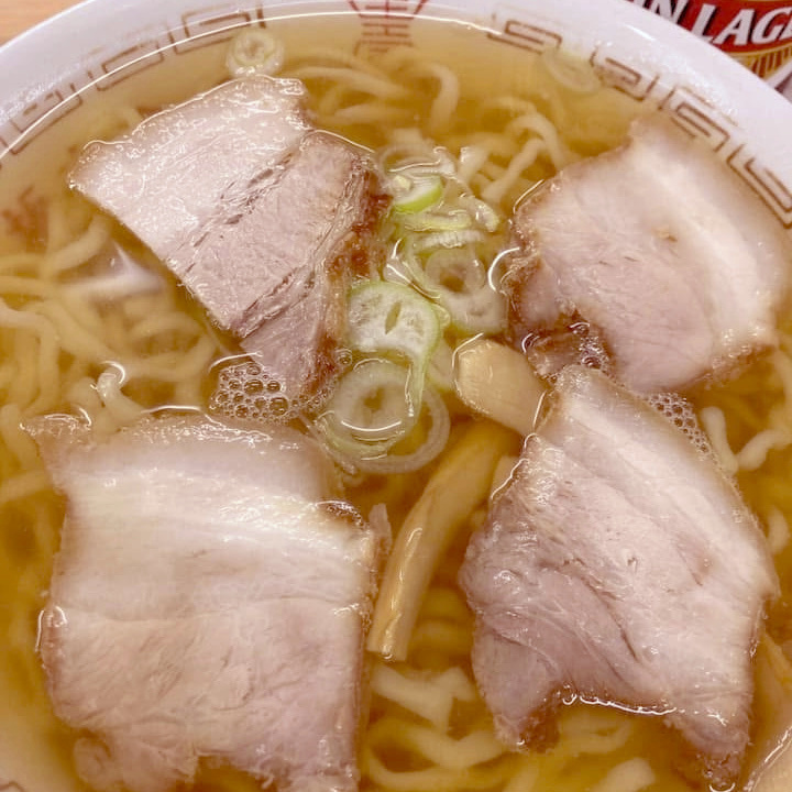 続いて、お待ちかねの「しなそば」が到着しました。坂内食堂の定番である円形に並べられたチャーシューがきらきらと光り、透き通ったスープも黄金色に輝いています。見た目だけで圧倒される一杯です。