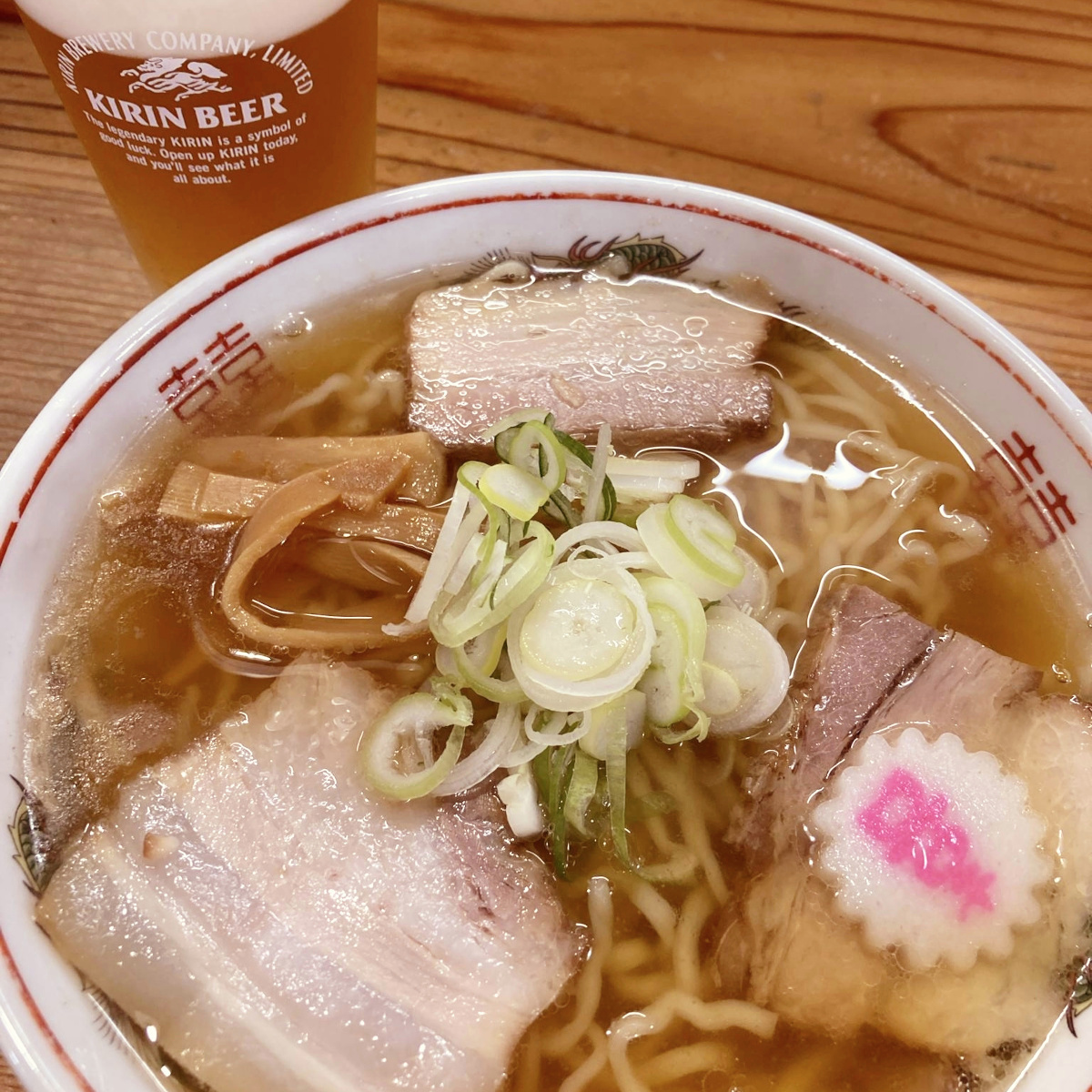 まずその店構えが素晴らしい。緑色の大きな看板と堂々たる建物が目を引きます。貫禄のあるのれんをくぐると、昭和初期にタイムスリップしたかのような店内にほっとするのは私だけではないでしょう。入り口左手で食券を買い、席に着きます。最初にいただくのはまずはビール。すると白菜のお漬物がお通しとして提供されます。これが旨い。喜多方のおばあちゃんが漬けました!と言わんばかりの懐かしい味に、ビールが止まりません。