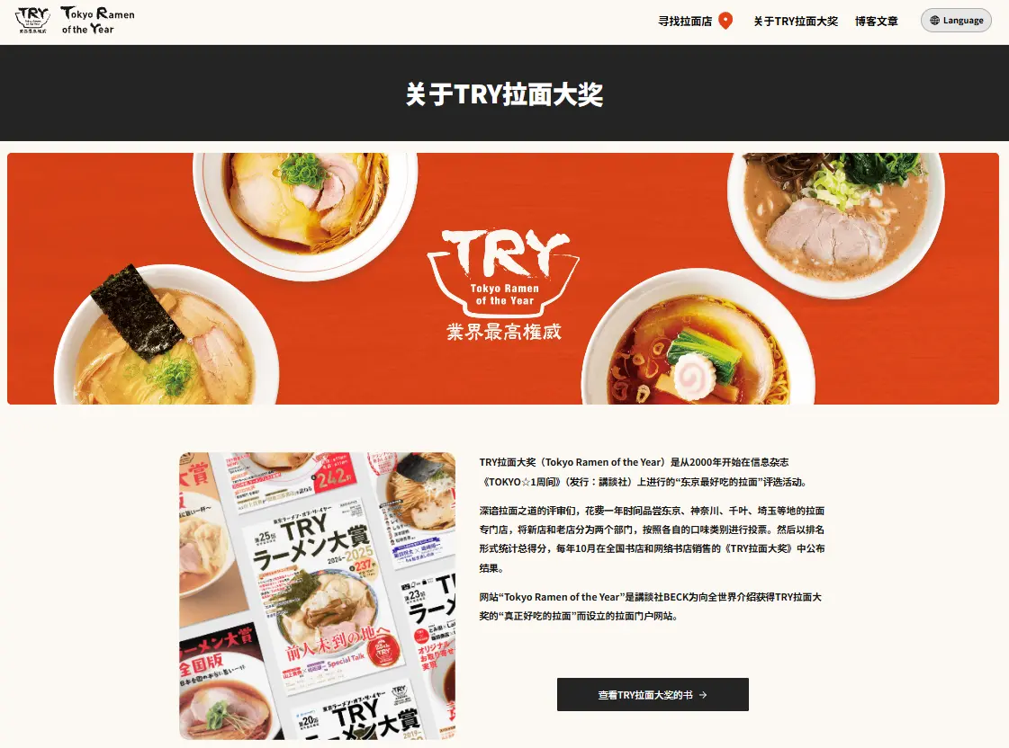 26年の歴史と権威を誇るラーメン専門誌『TRYラーメン大賞』。その公式ウェブサイトである「Tokyo Ramen of the Year」は、2025年12月17日の本格公開後のアップデート第1弾として、英語版および中国語(簡体字)版を公開し、多言語対応を開始しました。