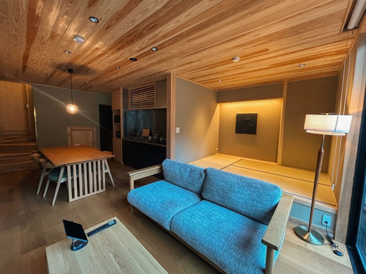 自然素材が随所に取り入れられた室内に一歩足を踏み入れると、温もりを感じるナチュラルな空間に癒される。手前のダイニングキッチンには大きなテーブルがあり、IHコンロのほか大きな冷蔵庫や電子レンジ、オーブントースター、さらに調味料や食器、カトラリーと設備も充実。洗濯機も備え、まさに暮らすように旅をすることが可能だ。リビングスペースには、ゆったりできるソファと小上がりになった畳スペースがあり、大の字になって寛ぐこともできる。