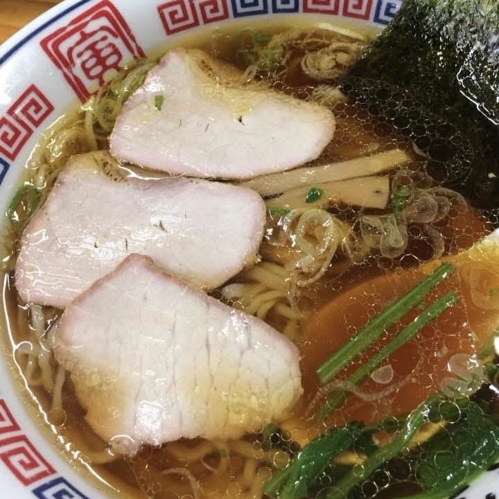 いただいたのは定番中の定番「手打ち中華そば」です。まずはその姿が美しい。白河ラーメンの特徴である赤い縁のチャーシューが琥珀色のスープの中で輝いています。チャーシューは3種類ありますが(バラ・肩ロース・モモのようです)、どれも柔らかくて旨い。スッキリしながら旨味もしっかり感じられるスープと縮れ麺との相性も抜群です。さすが老舗の味、もう一杯いけそうです(笑)。