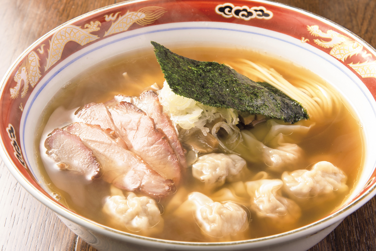 着丼した瞬間、たっぷりのワンタンとチャーシュー、そして流麗な麺に目を奪われる。手繰れば香り高いスープを呼び込み、細くなめらかな麺がつるりと口中へ滑り込む。ワンタンはまさに雲を呑むようなつるりとした皮の中に肉肉しい餡がゴロリ。食べ応えのある一杯だ。