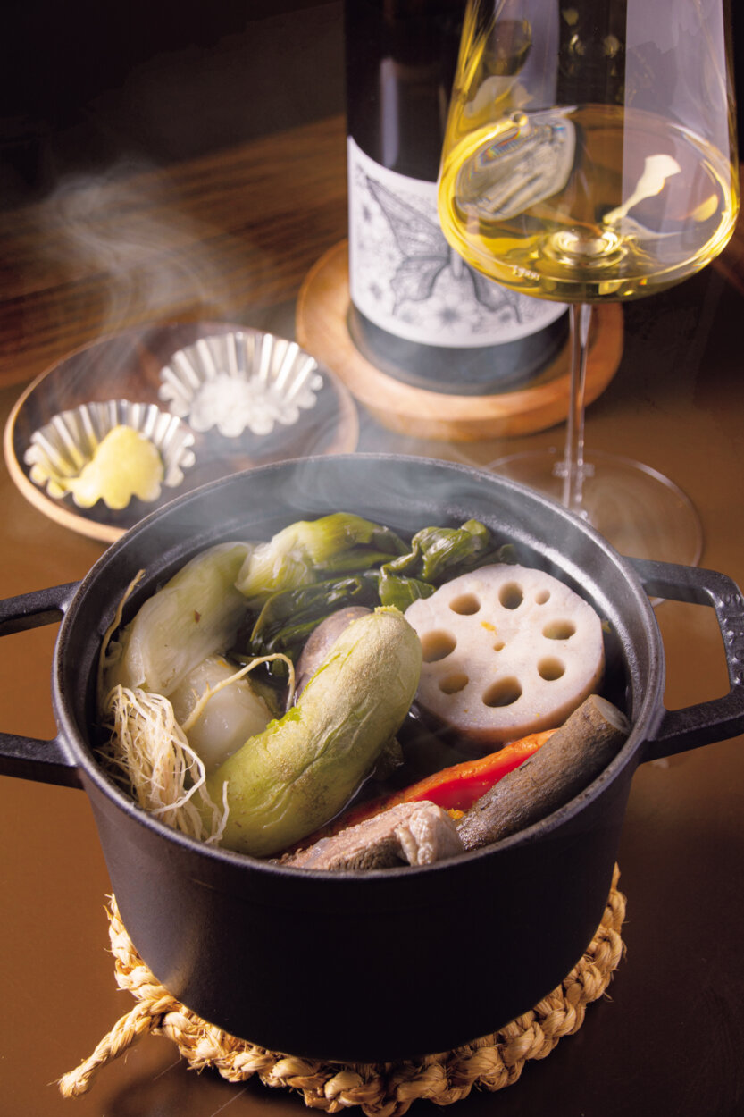 寒くなってくると、メニューに熱々の料理が加わる。ココットにたっぷりの「ポトフ」は、農薬や肥料に頼らない野菜が主役。ふたを開ければ大根や白菜など日本の野菜がぎっしりと顔をのぞかせた。
