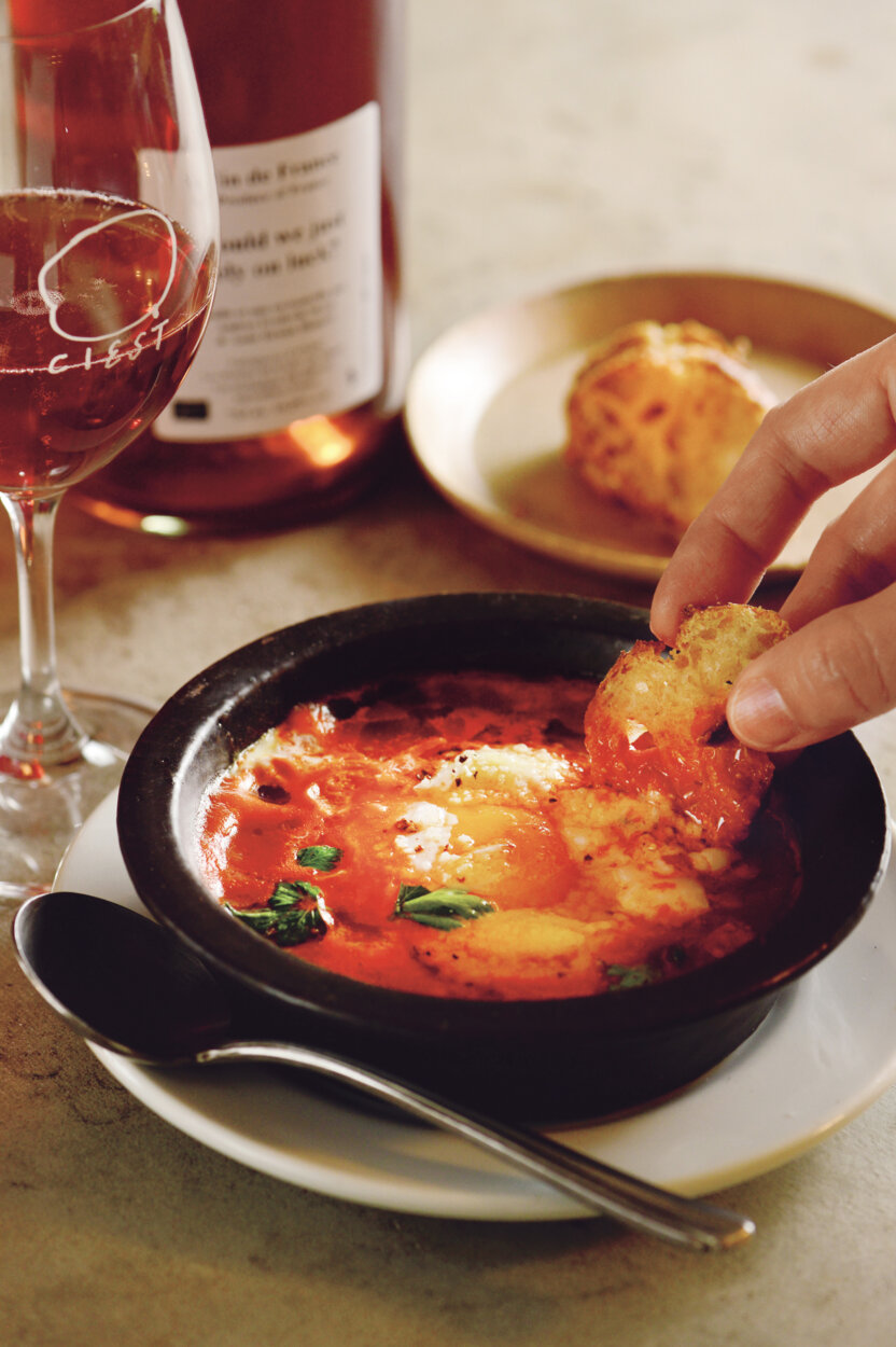 煮込みとワインを取り持つ名立役者は、「パン」でした。東京・清澄白河のパン屋『CIEST(チェスト)』には入口がふたつある。ひとつは“パンの入口”、反対側には“ワインの入口”と書いてあり、大変わかりやすい。店内は中で繋がっているが、“ワインの入口”から入ると、立ち飲みスペースでワインと料理が楽しめる流れだ。