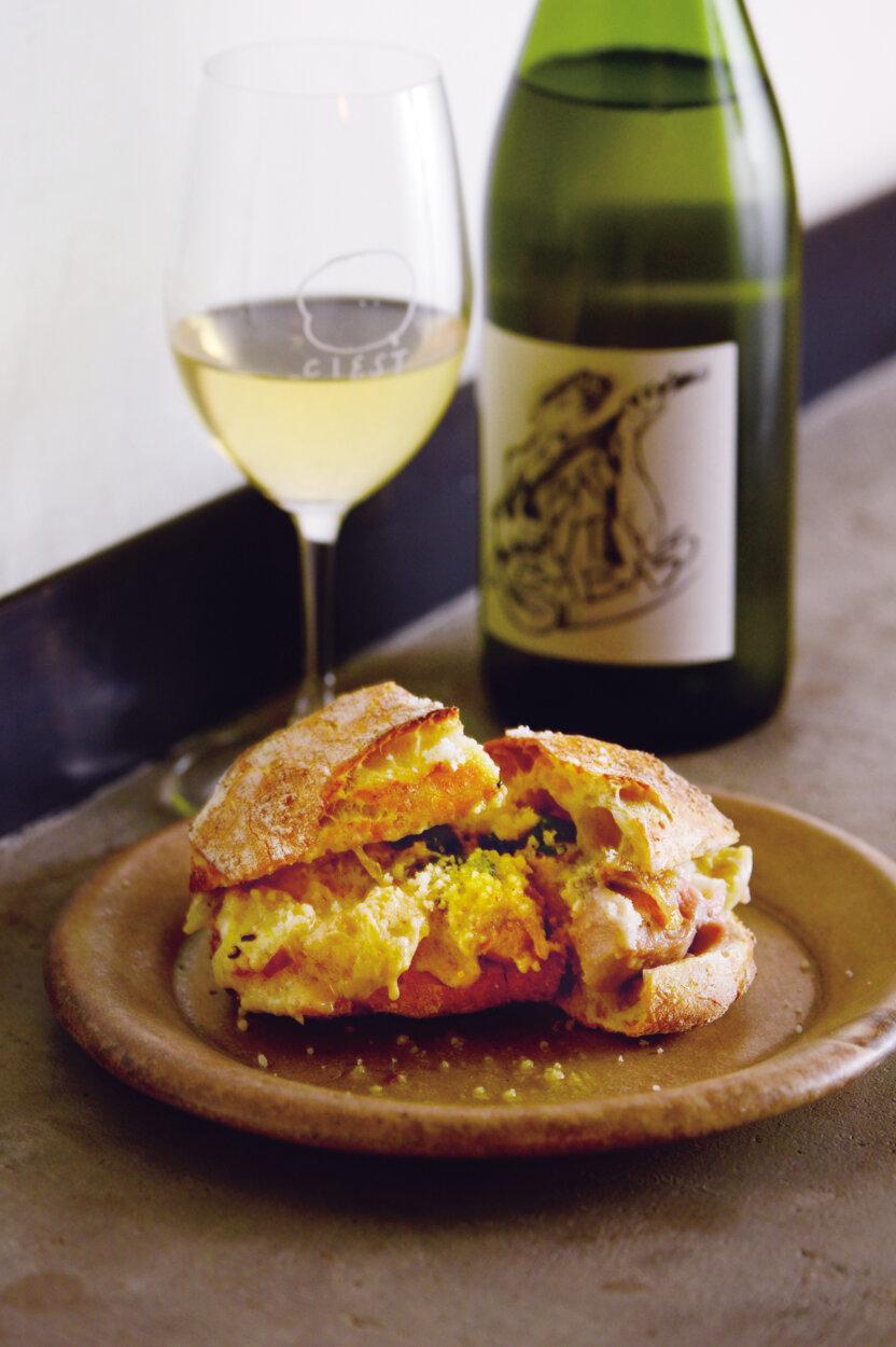 サンドイッチ・ローストチキンと白菜770円、グラスワイン1000円~