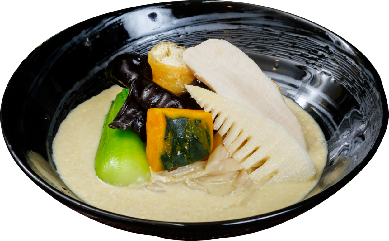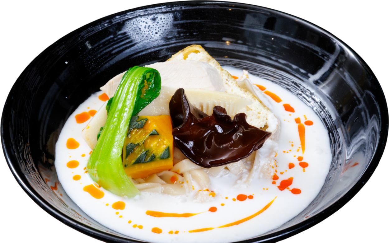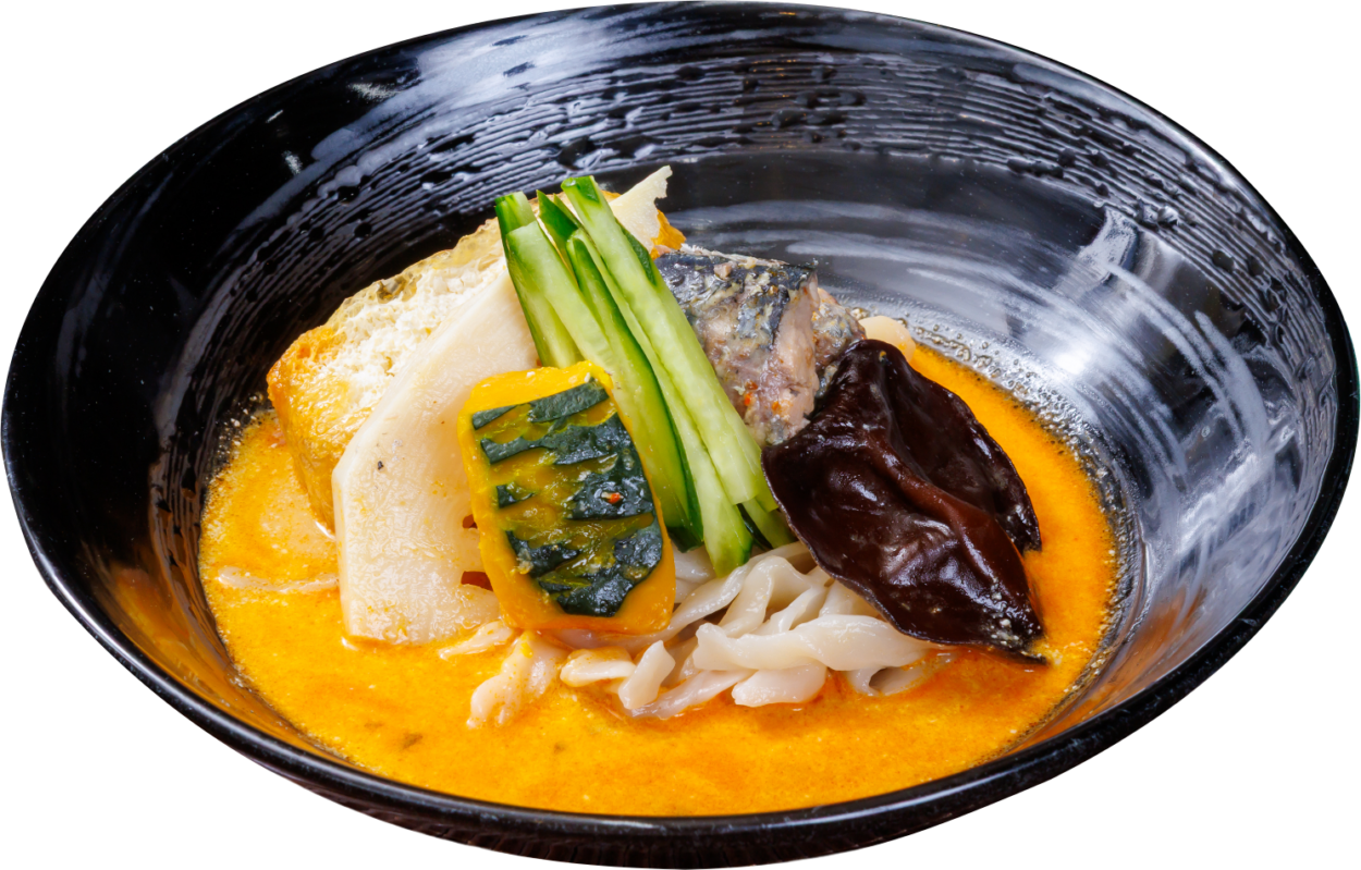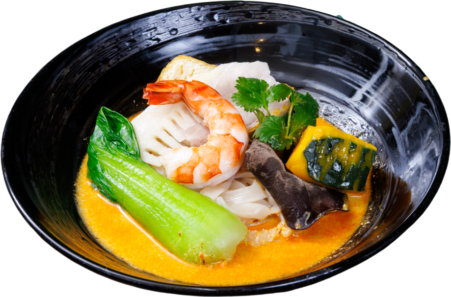 ココナッツミルクとかぼちゃを使用したスープは甘みがあり、食べやすい仕上がりに。とろっとした質感になっており、麺にもよく絡むという。