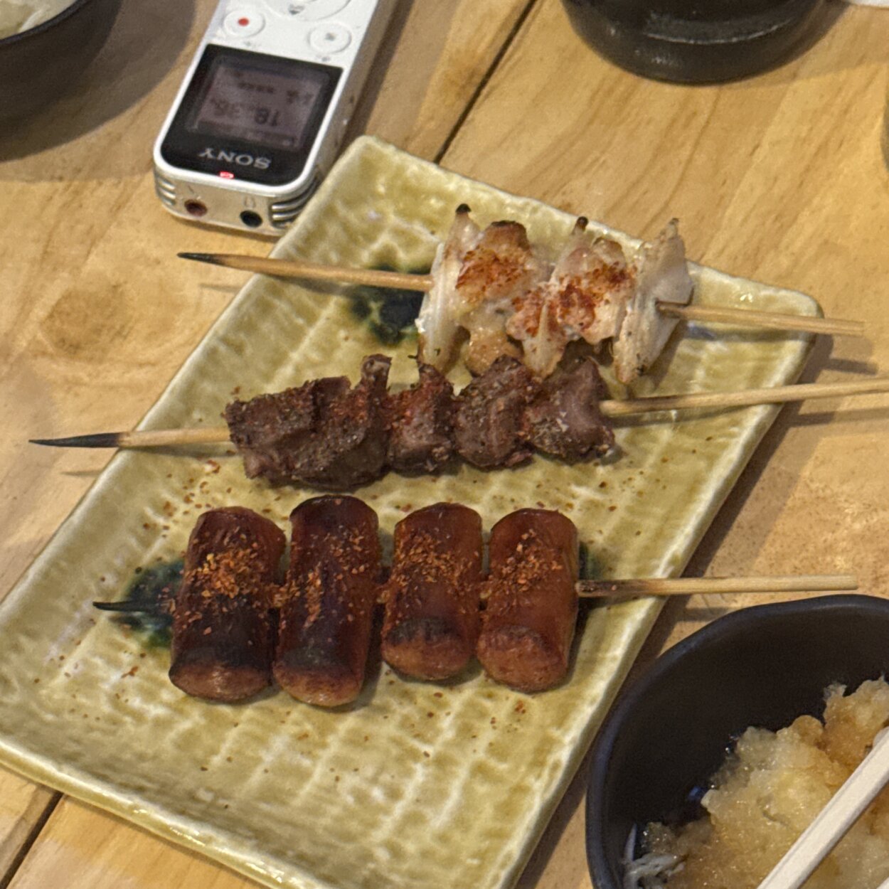 2軒目には、散策中に気になった人気の焼鳥屋さんへ。中の焼酎がたっぷりのホッピーに顔を綻ばせながら、やげん(軟骨)や胡椒たっぷりの「鬼砂肝」、チョリソーを注文します。