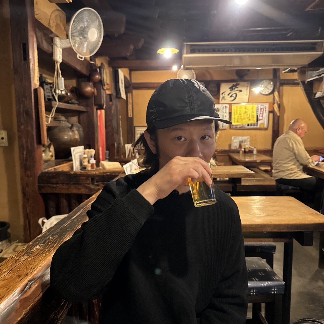 ほかにも気になるメニューが多く、1軒目で頼みすぎるのは良くないと話しつつも、牛すじ煮込みとレバカツを注文してしまいます。大学時代の思い出が詰まっているという芋焼酎「さつま白波」のお湯割りと合わせて楽しみます。