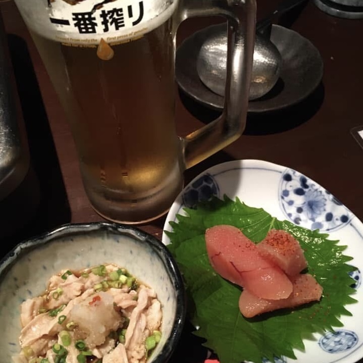 まずは、博多名物「明太子」と「酢もつ」をビールと合わせます。これだけでテンションマックス。口の中に福岡を感じ幸せを噛みしめます。