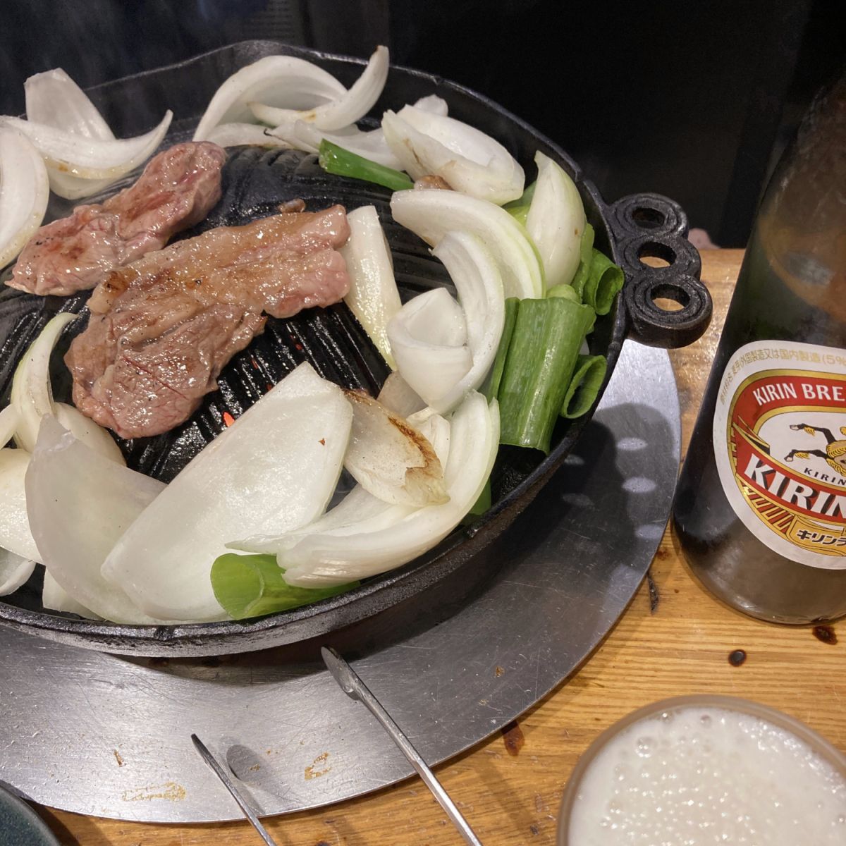 多くの人が並んでいます。約40分後、入店。まずはビールを注文します。出てきた生ビールは保冷タンブラーに入っています。おつな仕掛けですが、保冷する間もなくあっという間に飲み干しました(笑)。続いて、定番の「成吉思汗」と瓶ビールと追加。まず生の肉をご覧ください。色がめちゃくちゃ綺麗です。これだけでビールが飲めそうです(笑)。