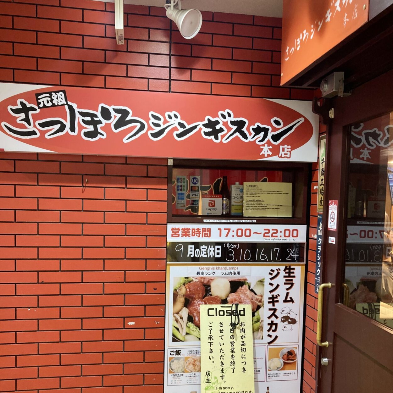 次にもう1軒『さっぽろジンギスカン本店(札幌市中央区)』をご紹介します。なのですが、少々出遅れ21時ごろに訪問したところ、お肉の売り切れで営業終了。「ま、まさか、、、」。スキージャンプの男子スーパーチームが、降雪で競技中止になったときの心境に似ています。大変残念ながら実食は出来ませんでした。皆さまも早めにお出かけください。
