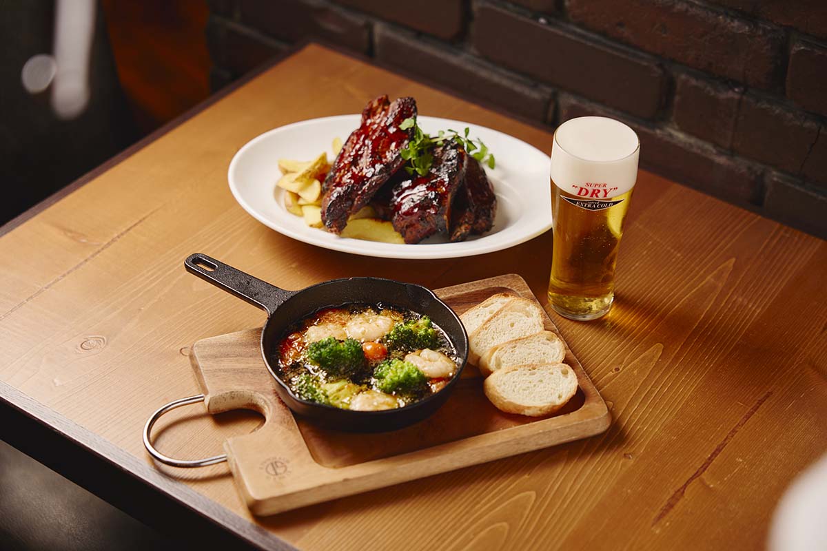 2階の「RESTAURANT」フロアでは、「スーパードライ」の特長である“辛口のうまさ”を引き立てる、熱々のフードメニューなどが楽しめる。