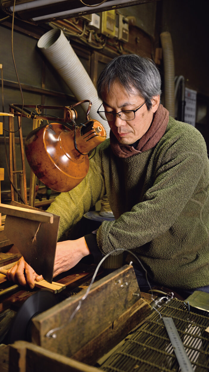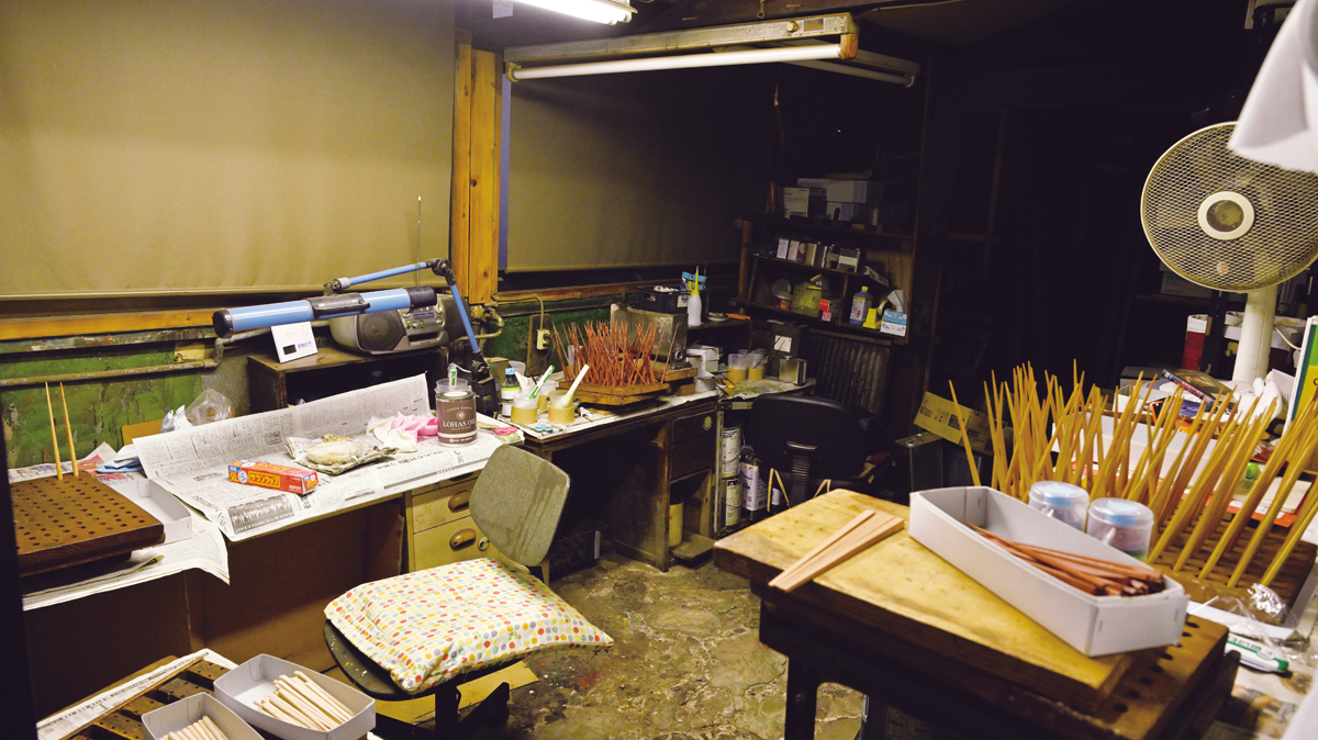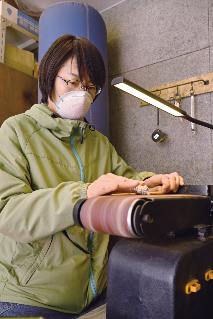 箸販売員から携わること22年。小割り材から八角形の箸にするまでに、回転するヤスリの番手を上げながら磨きをかけ、一本仕上げるまでは約30分をかけるという。そのあとは2階の作業場で漆塗りだ。乾燥させて完成。やりがいは「『こないだの、持ちやすかったからまたお願い』と言われたときですね」。