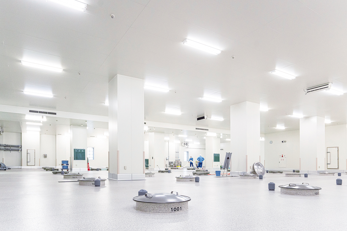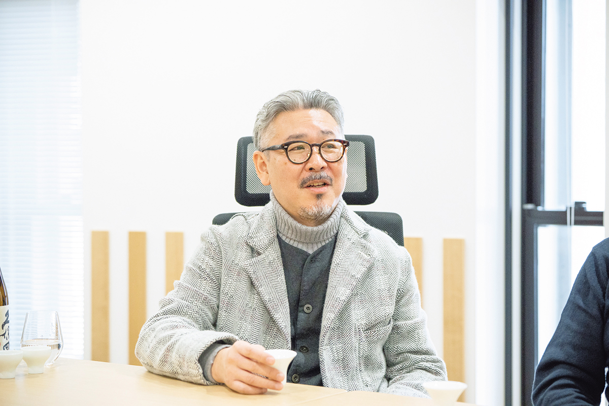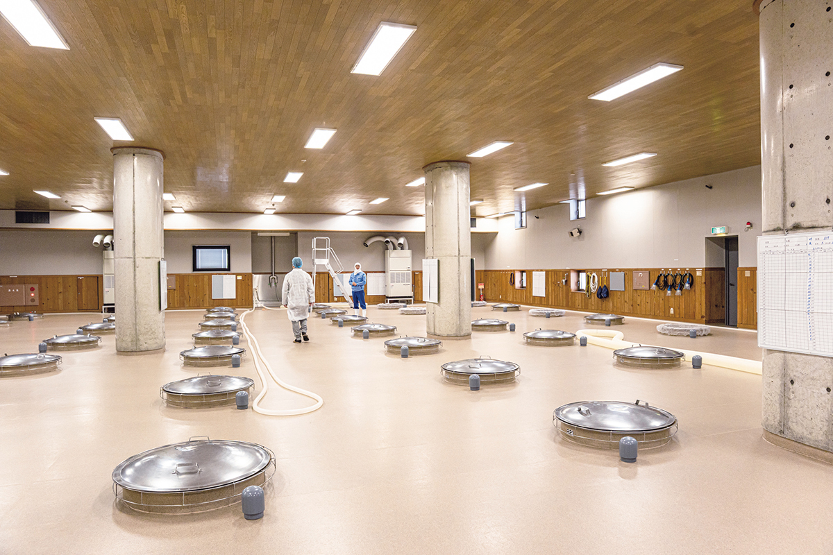 一面の雪景色が広がる一月下旬。長岡駅から車で三十分ほど走ると、白の世界の中にひときわ端正な建物が姿を現す。ここが、朝日酒造だ。広い敷地内には性格の異なる二つの蔵があり、まず案内されたのが2011年に竣工した松籟蔵。ここでは「千寿」や「百寿」、そして地元で長く愛されてきた銘柄「朝日山」など、日々の食卓に寄り添う酒が造られている。