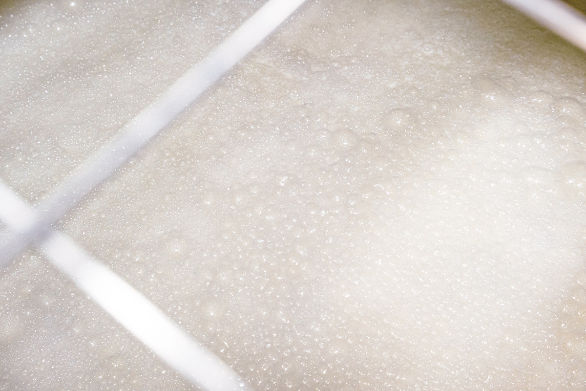 整然とした仕込み室にタンクが並ぶ。もろみの泡立ちを眺め発酵状態を確認する