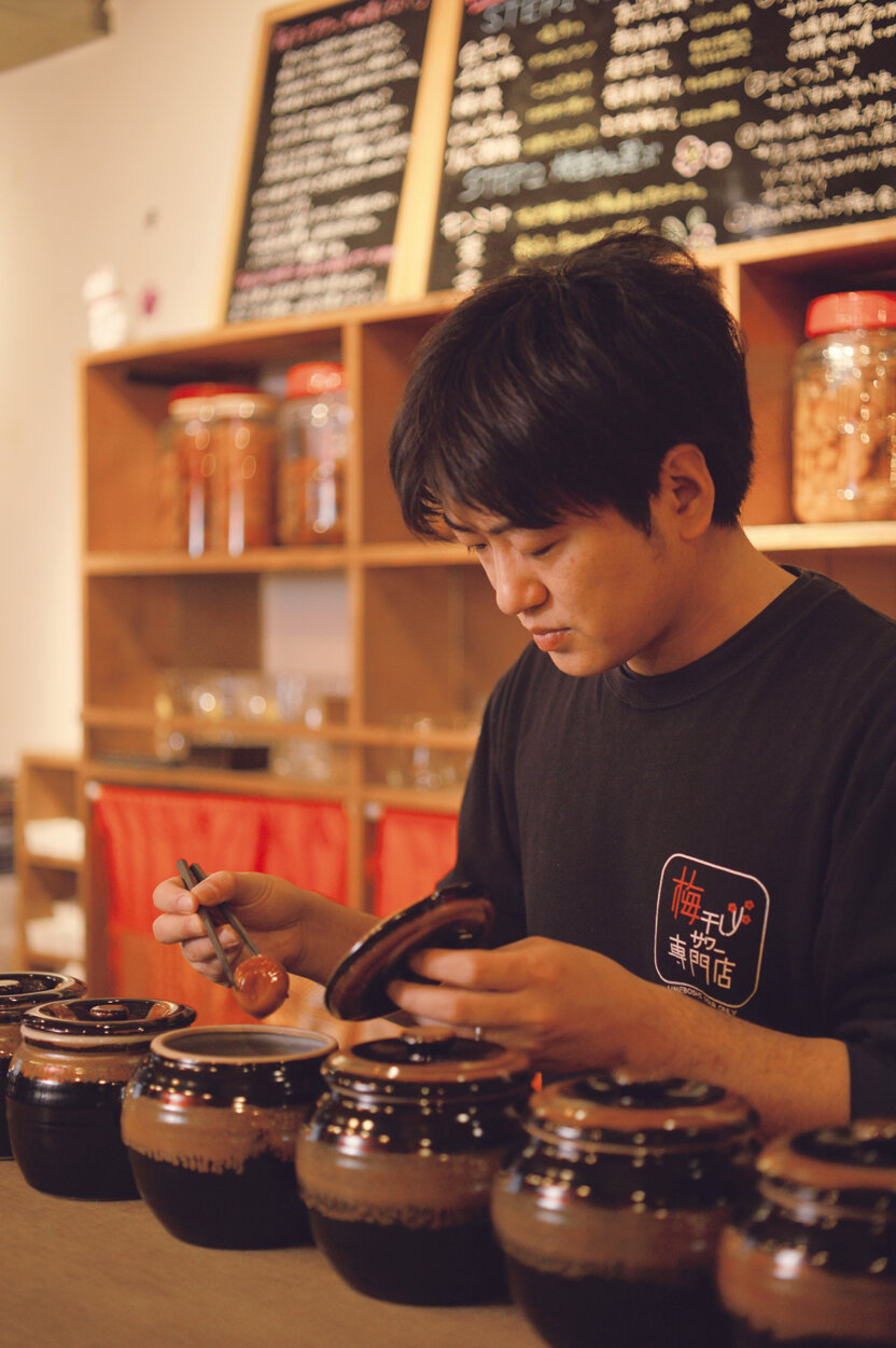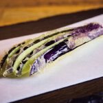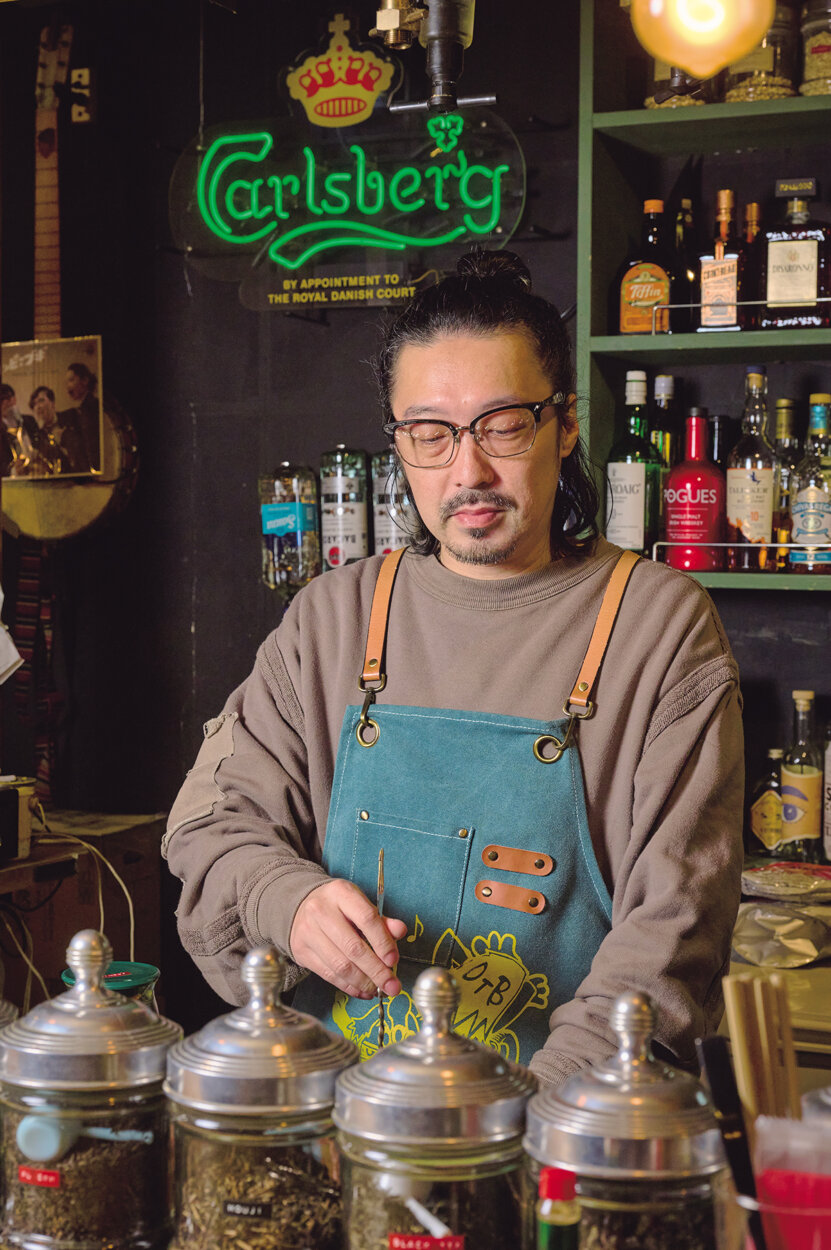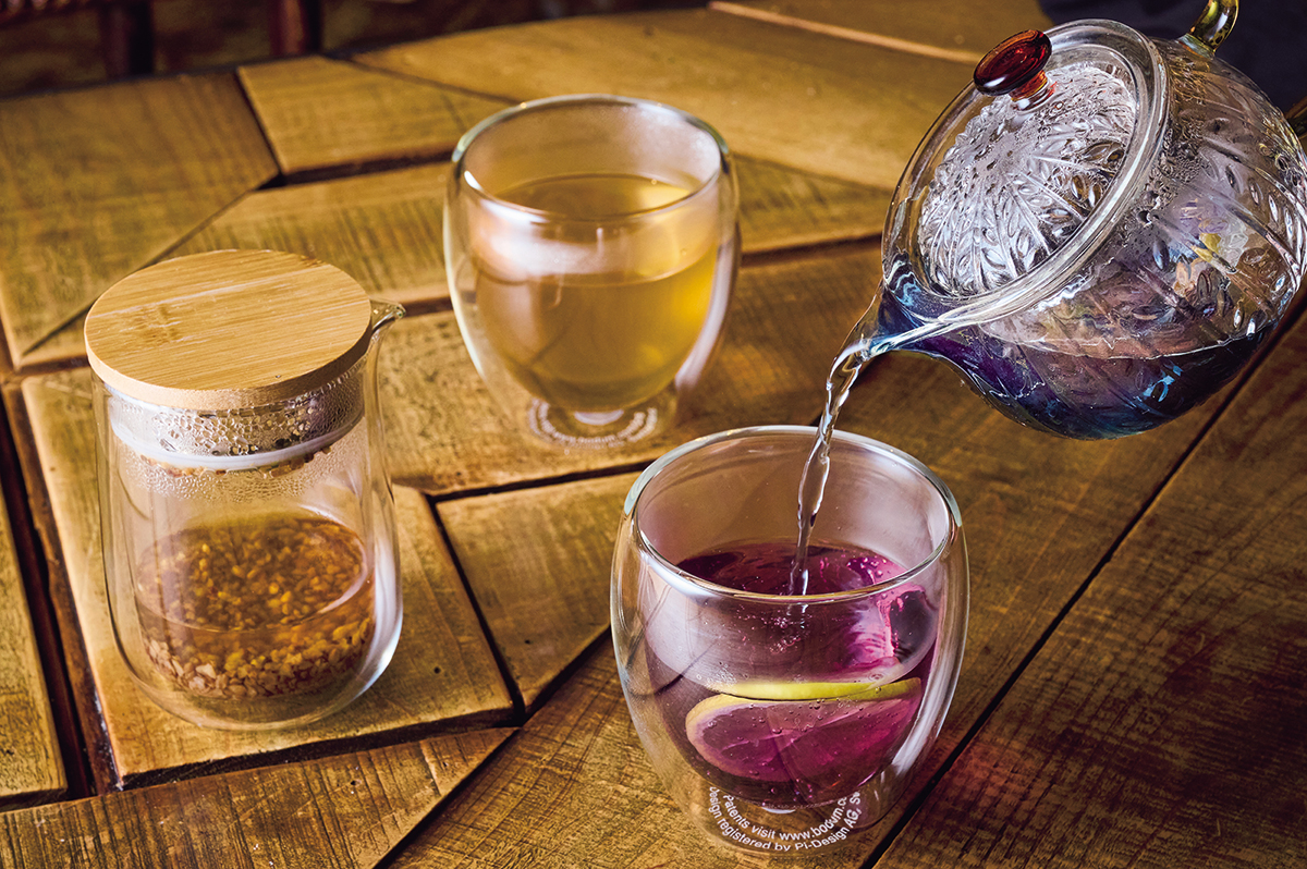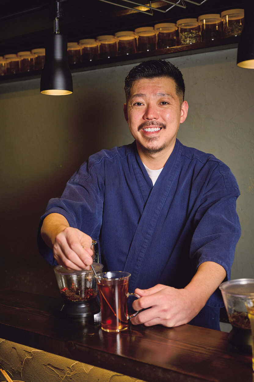 ポットに入ったきれいなブルーのアンチャンティー。バタフライピーというハーブを使ったタイのお茶だが、これを酒粕焼酎の中へ。鮮やかな紫に色が変わり、口に運べば少し香ばしい焼酎の香りと相まってほのぼの旨し。これはほんの一例で、割るお茶とベースの酒の種類を選んで好みの茶割りを探せること実に221通りの“茶割”ダイナーなのだ。