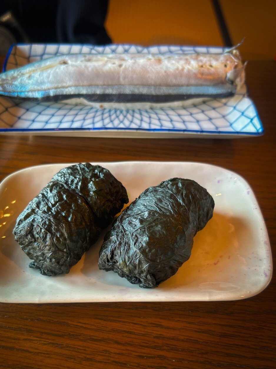 自身で手作りした「めはり寿司」(手前)と「さんま寿司」(奥)を味わうランチタイム