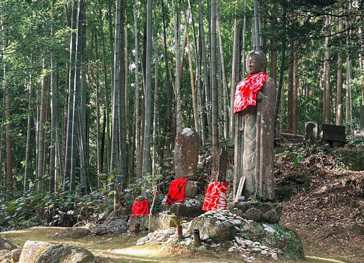 しばらく歩くと、穏やかな表情のお地蔵さまが姿を現す。ふと足元に目を向けると、その姿にふさわしくない、弾丸の痕がある。