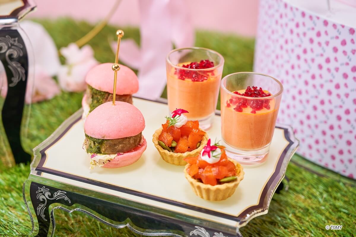 アフタヌーンティーのメニューには、リカちゃんが大好きないちごとローズをテーマ食材として使用。スイーツにはいちごパンナコッタとローズゼリー、いちごのタルト、いちごのベイクドチーズケーキなど、セイボリーにはピンクミニバーガー ミントジェノベーゼソース、スモークサーモンのタルトレットなど、ピンクや赤を基調とした華やかなラインナップだ。5月26日からは新緑をイメージし、ピスタチオを使ったメニューに一部変更となる。